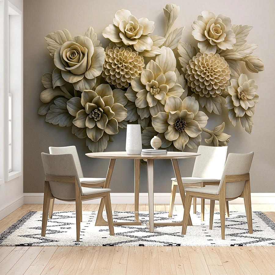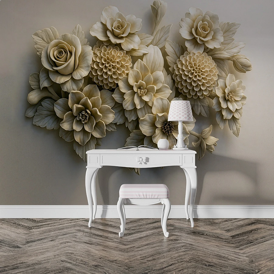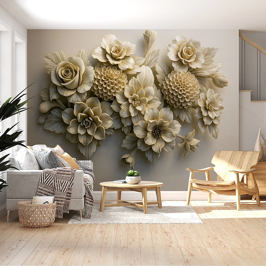 Rendered in warm beige and creamy tones, the sculpted flower design offers a calm yet luxurious atmosphere. Each petal appears gently carved, adding texture and dimension while maintaining a harmonious and neutral palette that blends effortlessly with modern interiors.