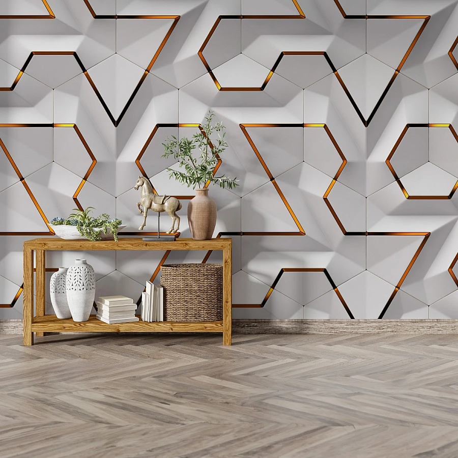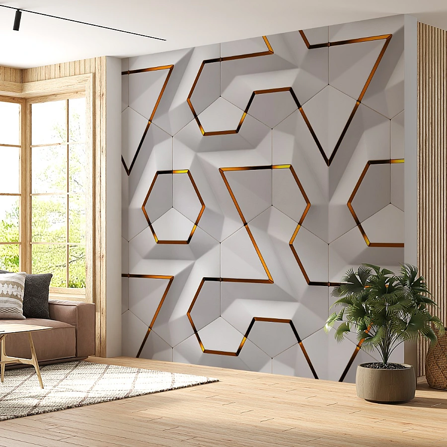 Clean white hexagonal forms create a striking architectural pattern in this modern 3D geometric wall mural. Accented with refined gold lines, the design introduces depth, structure, and a subtle sense of luxury to the space.