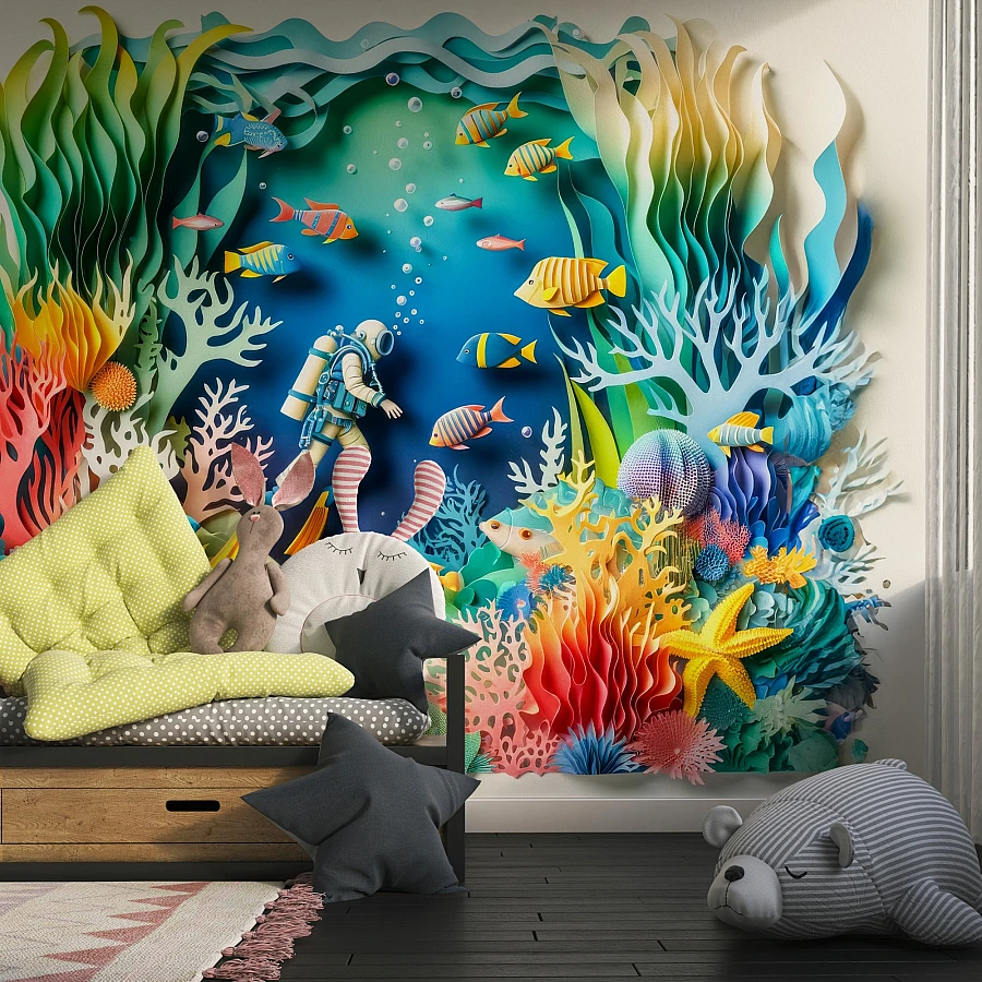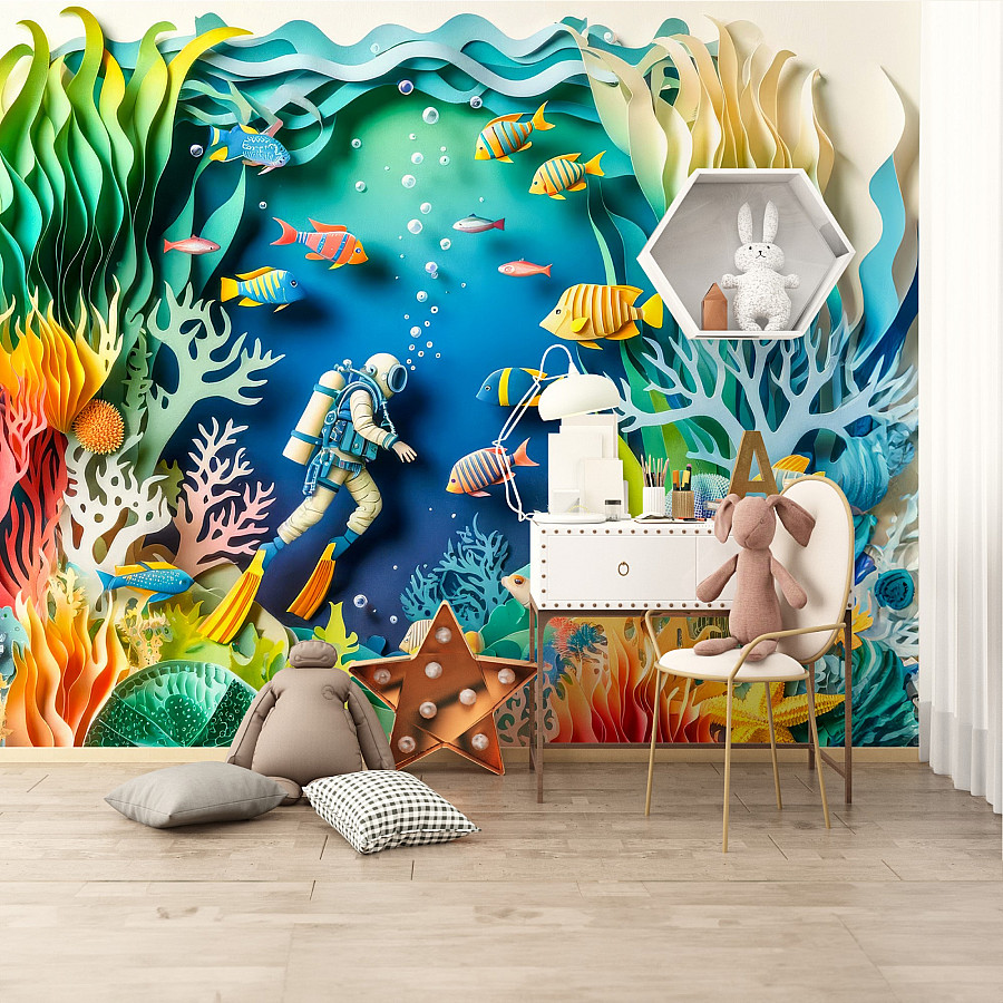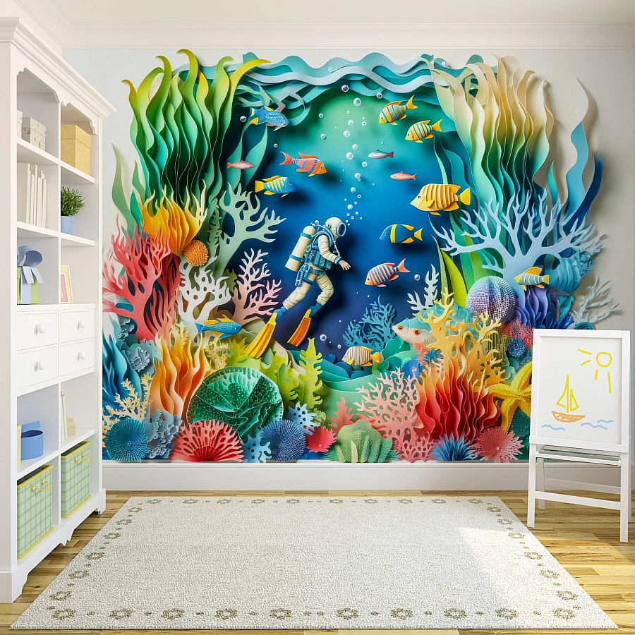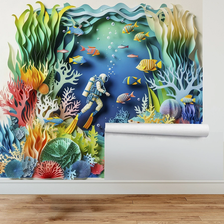 Tags: kids wallpaper, ocean mural, coral reef wallpaper, 3d paper cut mural, underwater kids decor, diver wall art