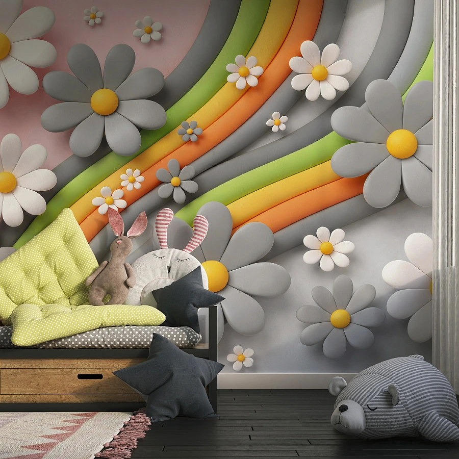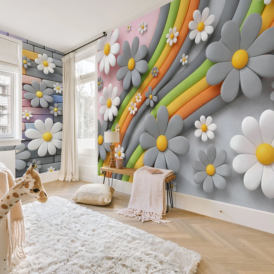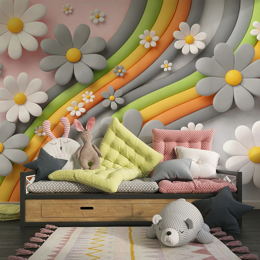 Playful daisies bloom across flowing rainbow waves in this delightful kids wall mural, creating a cheerful and imaginative atmosphere. The soft 3D effect of the flowers adds depth and charm, turning the wall into a vibrant garden of joy.