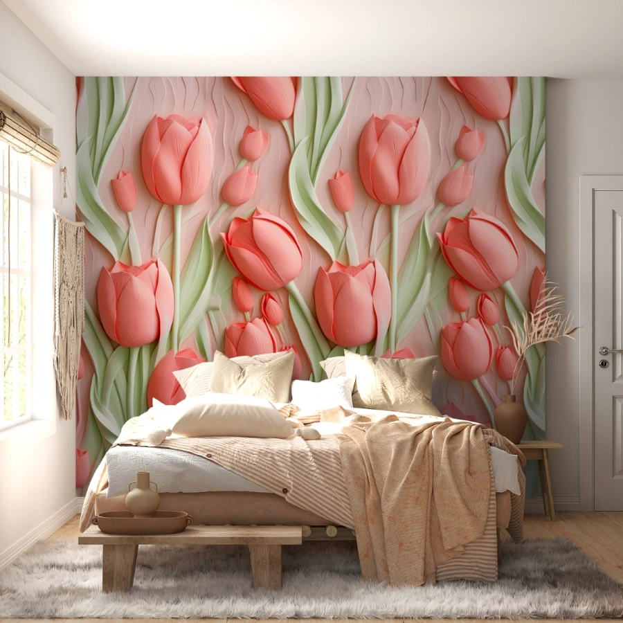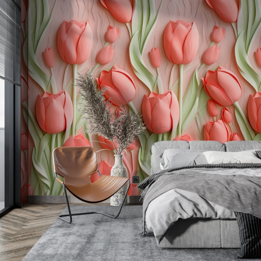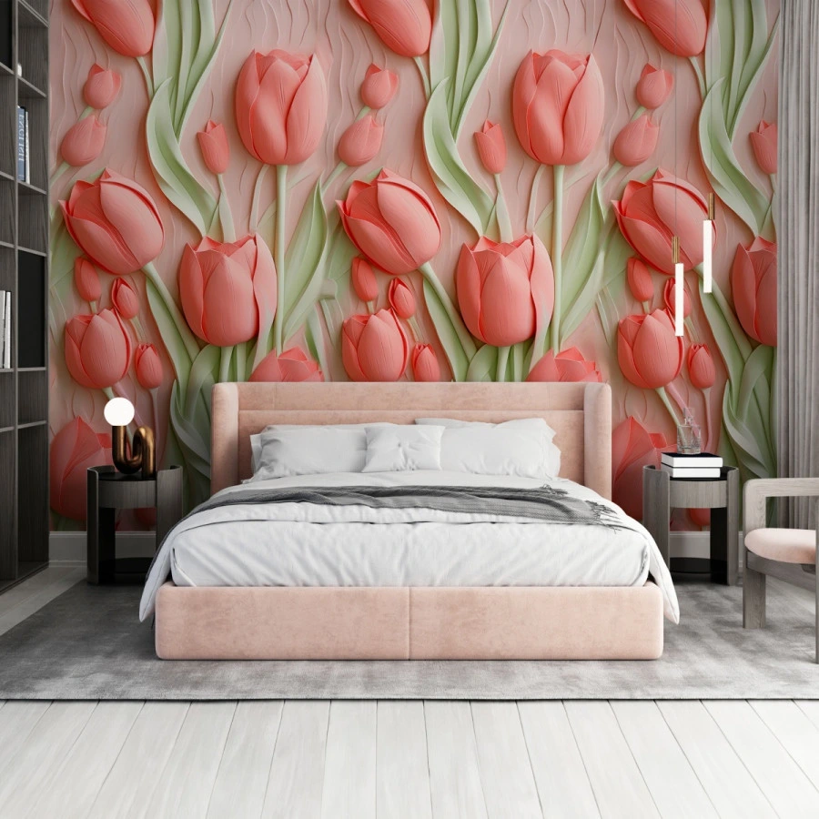 This tulip wallpaper features delicate pink tones combined with soft green leaves, offering a harmonious and calming aesthetic. The 3D effect enhances depth, bringing a lively and natural feel to the wall.