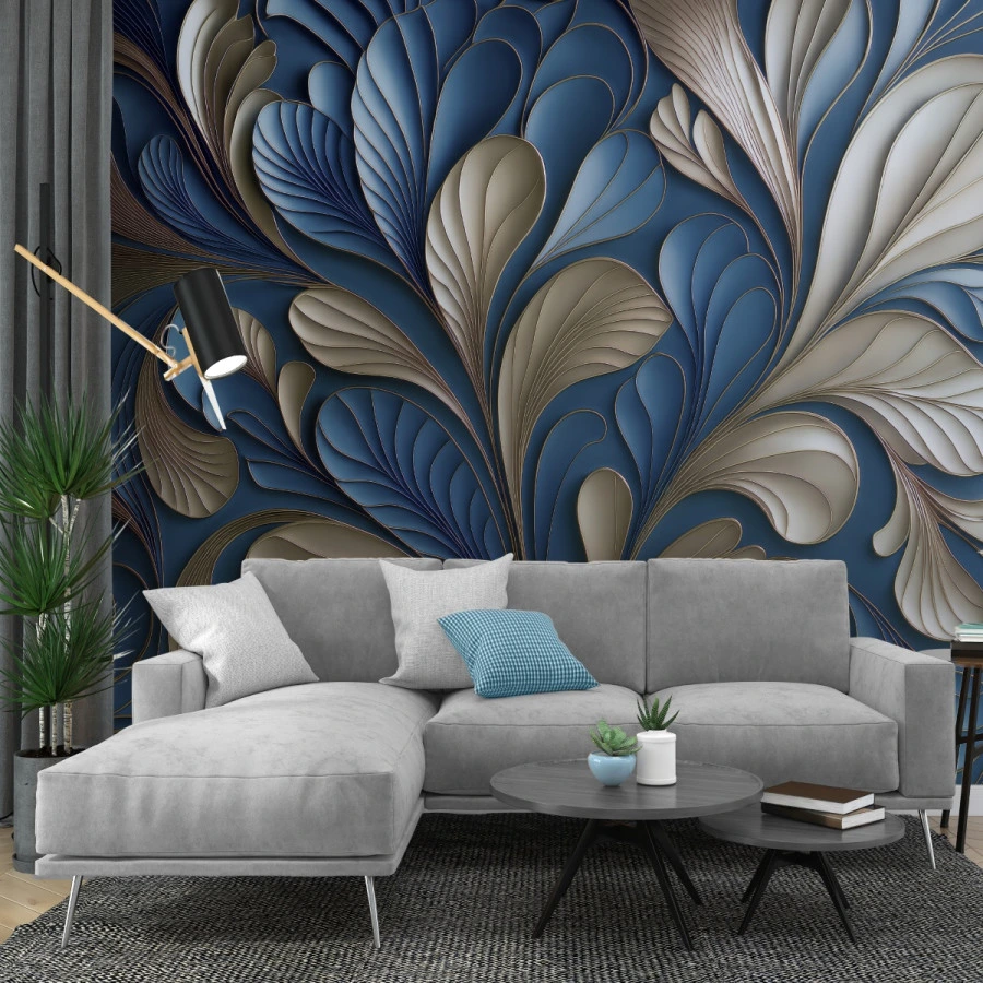 Abstract Blue Gold Leaf Wall Mural – Modern 3D Floral Design