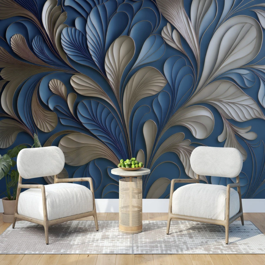 Flowing abstract leaves unfold in layered elegance across a deep blue backdrop in this stunning 3D wall mural. The sculptural composition creates a sense of movement and depth.