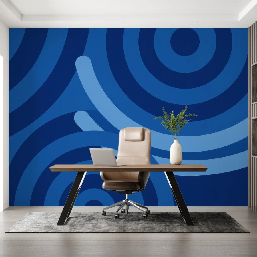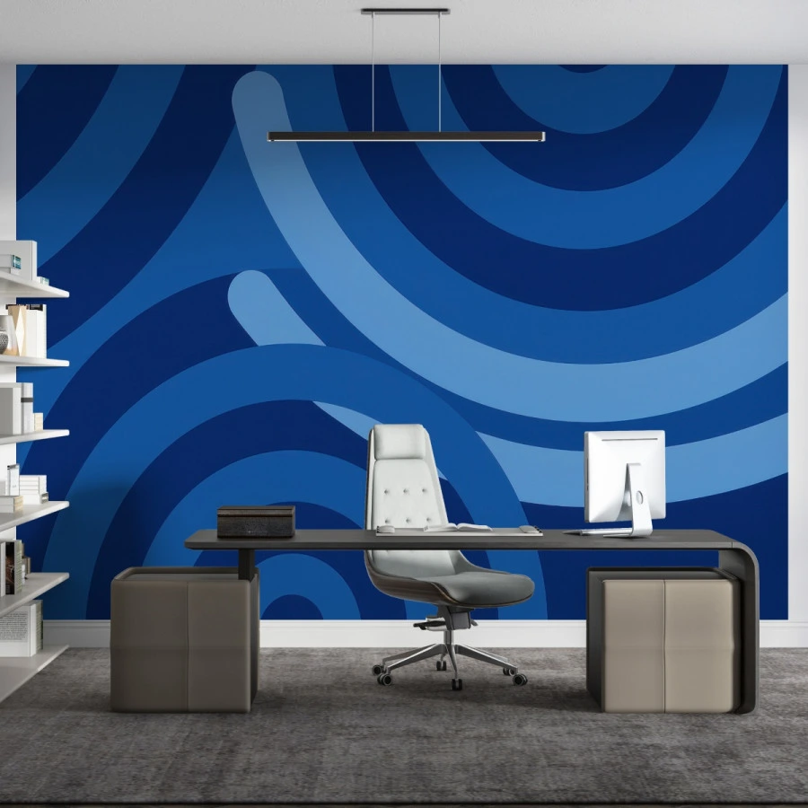 This blue geometric wallpaper features multiple shades of blue arranged in smooth, overlapping arcs. The clean design enhances depth while maintaining a sleek and contemporary aesthetic.