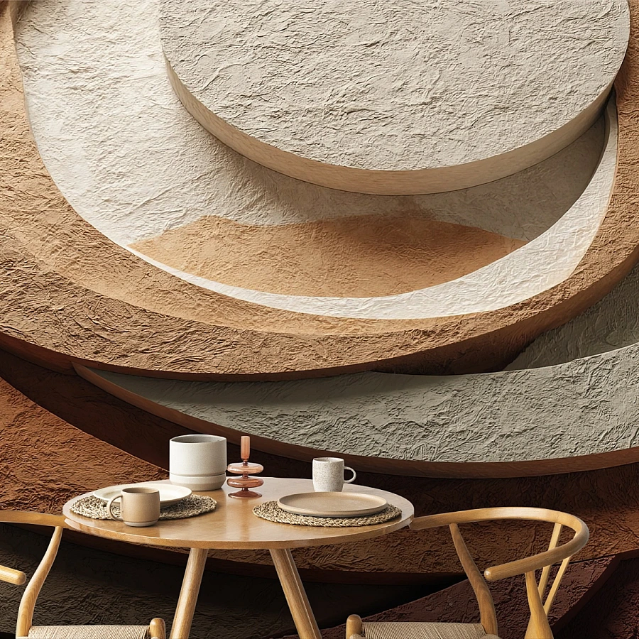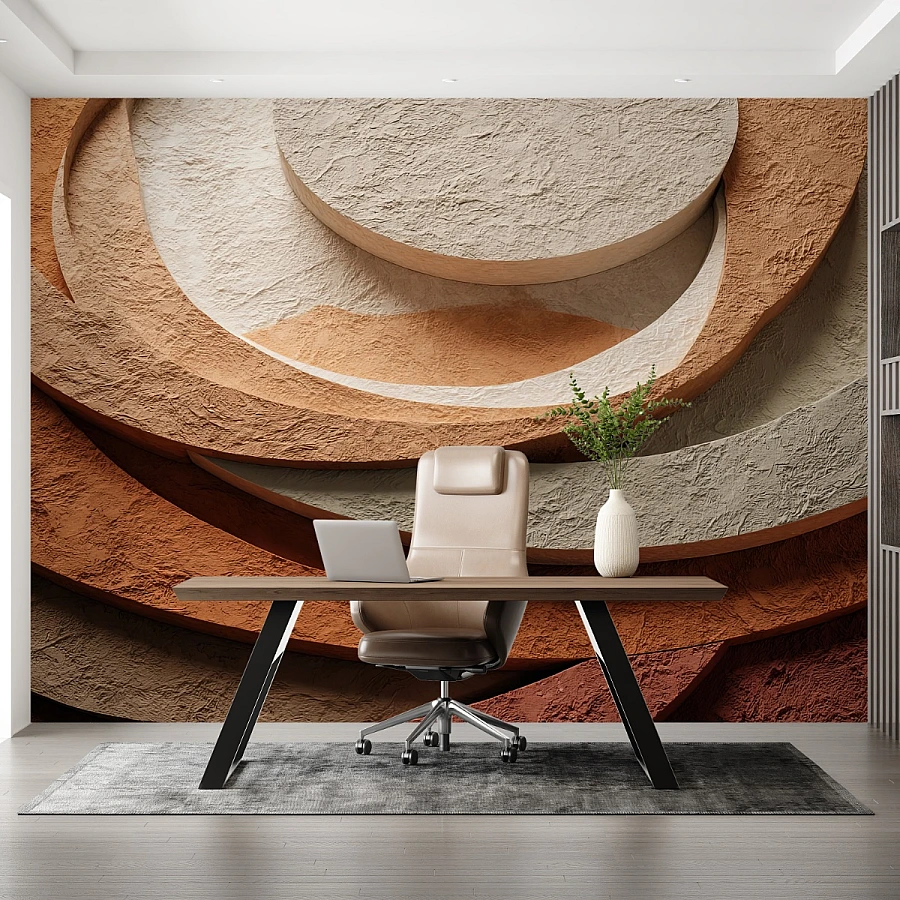 Layered circular forms in warm beige, cream, and earthy terracotta tones define this abstract wall mural, creating a bold and architectural visual statement. The sculptural arrangement of overlapping shapes brings depth and balance, transforming the wall into a modern design feature.