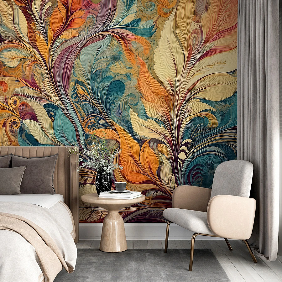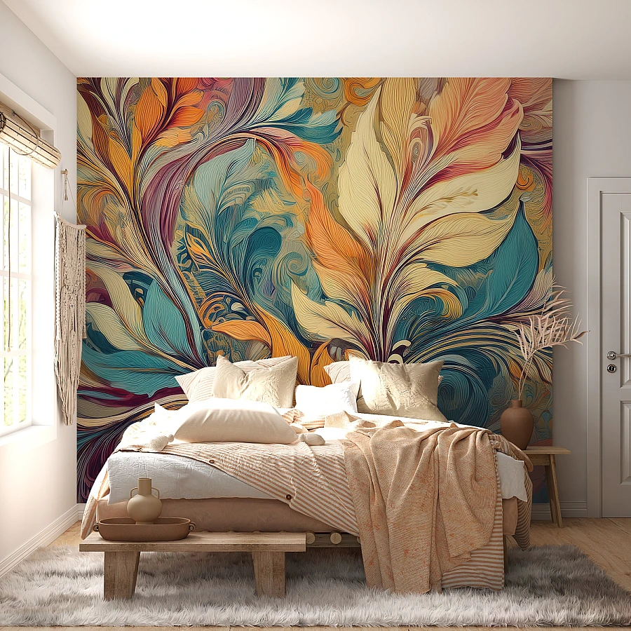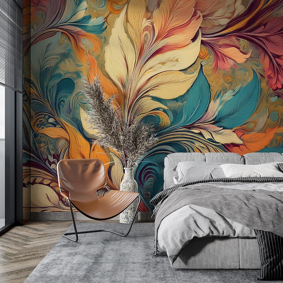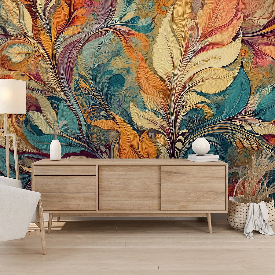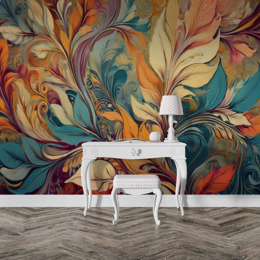 Swirling layers of deep teal, warm amber, burnt orange and soft cream tones move together like a living painting, creating a sense of motion and depth. Each curve and texture feels hand-crafted, giving the mural a luxurious, artistic presence that instantly elevates the space.