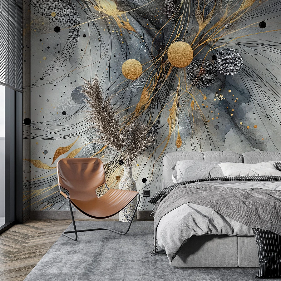 Dynamic lines and scattered forms flow across the surface in this striking abstract wall mural. Accents of gold splash through monochrome tones, creating a bold and expressive composition full of movement.
