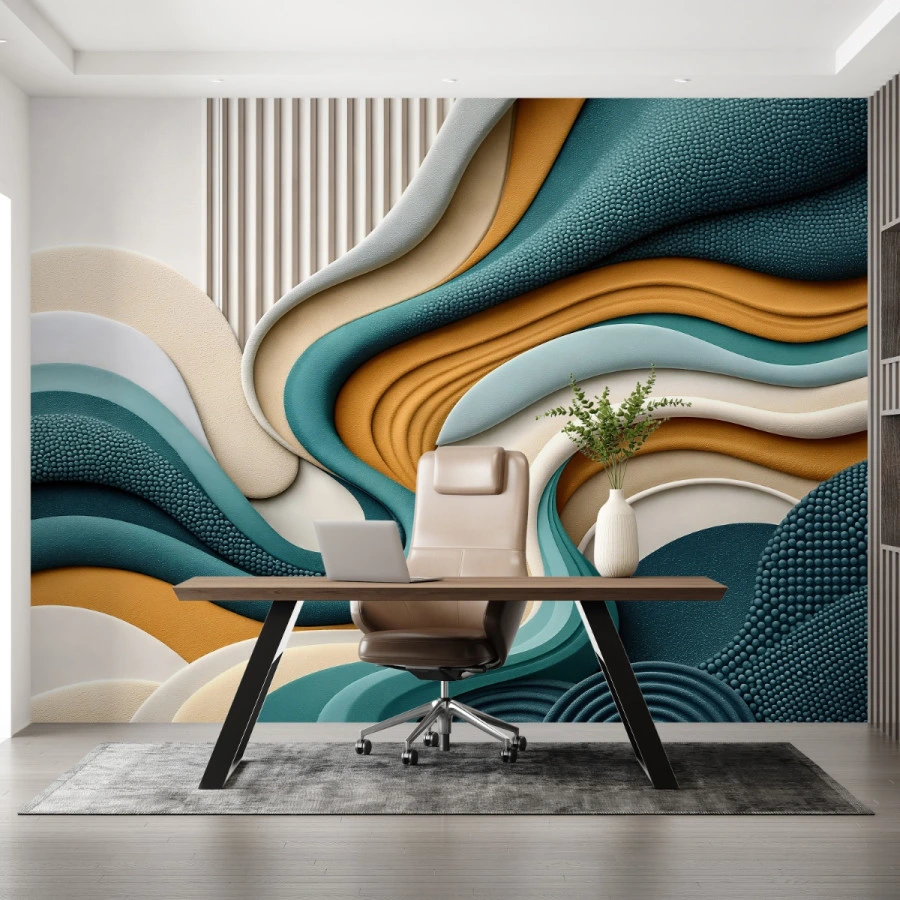 This modern abstract wallpaper blends teal, beige, mustard, and soft neutrals into a harmonious composition. The curved lines and textured surfaces create visual rhythm and a sense of fluid motion.