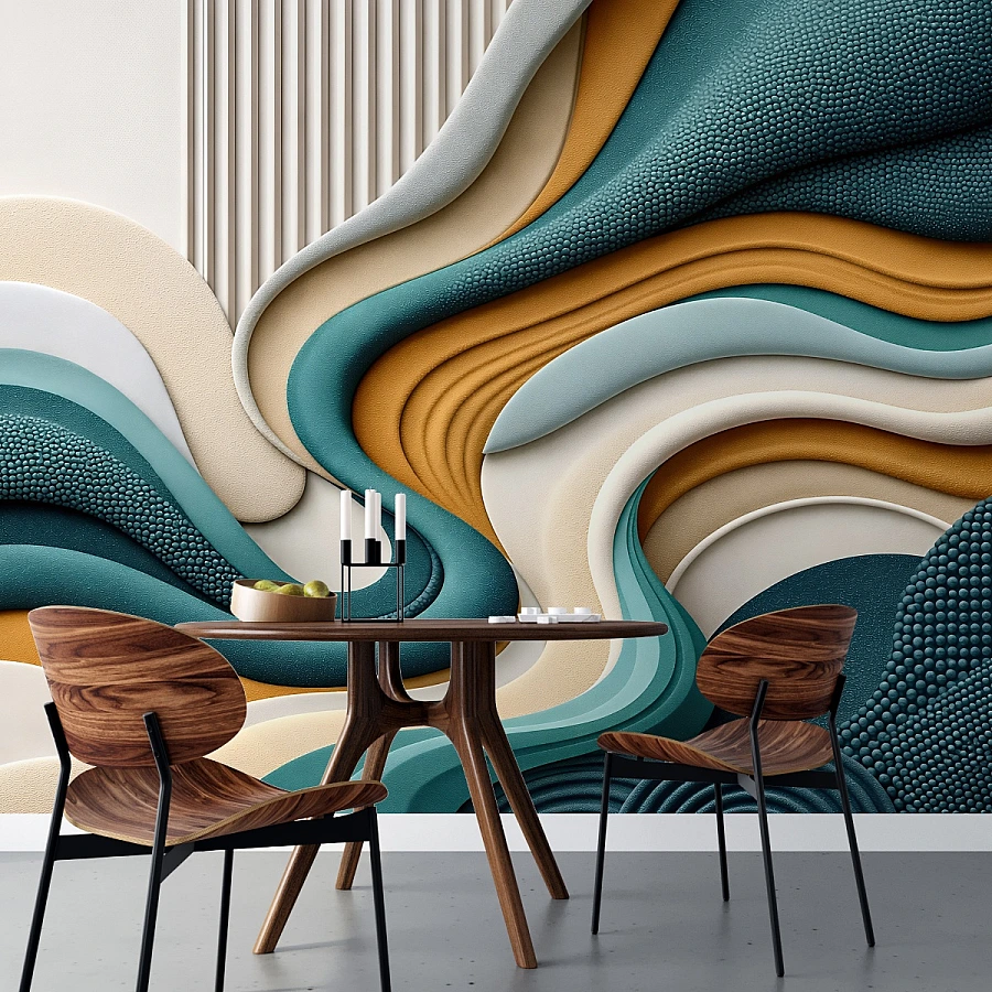 Flowing layers of color create a striking sense of movement in this dynamic abstract wall mural. The sculpted wave forms give a subtle 3D effect, adding depth and modern sophistication.