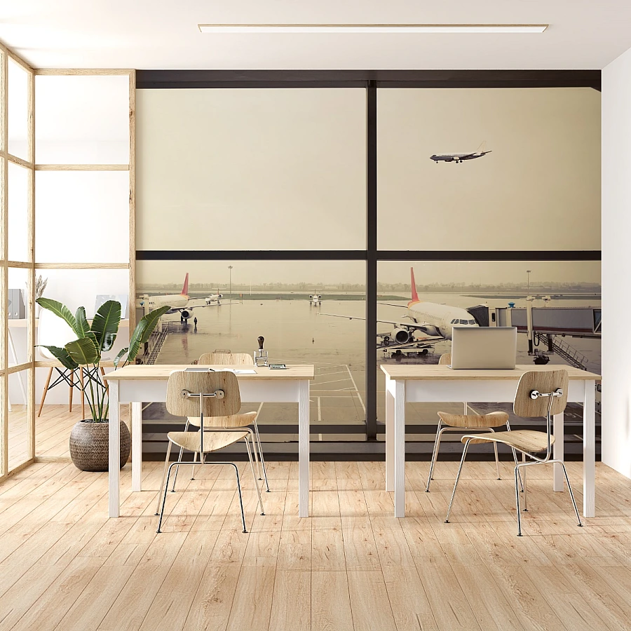 Perfect for professional environments and travel-inspired interiors, this mural transforms walls into a sophisticated aviation scene. It brings movement, perspective, and a contemporary urban atmosphere into the space.