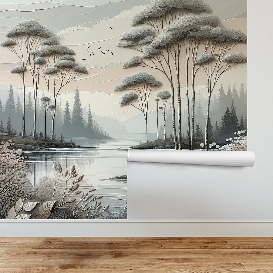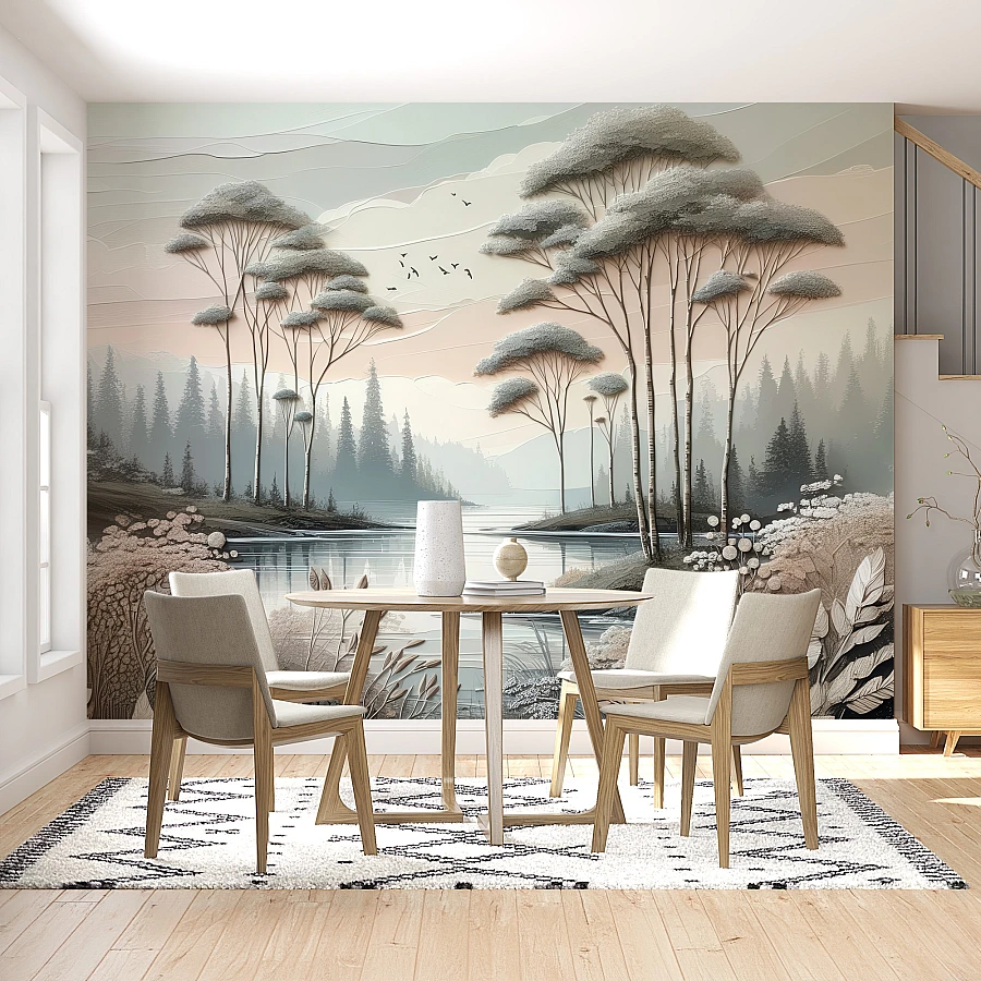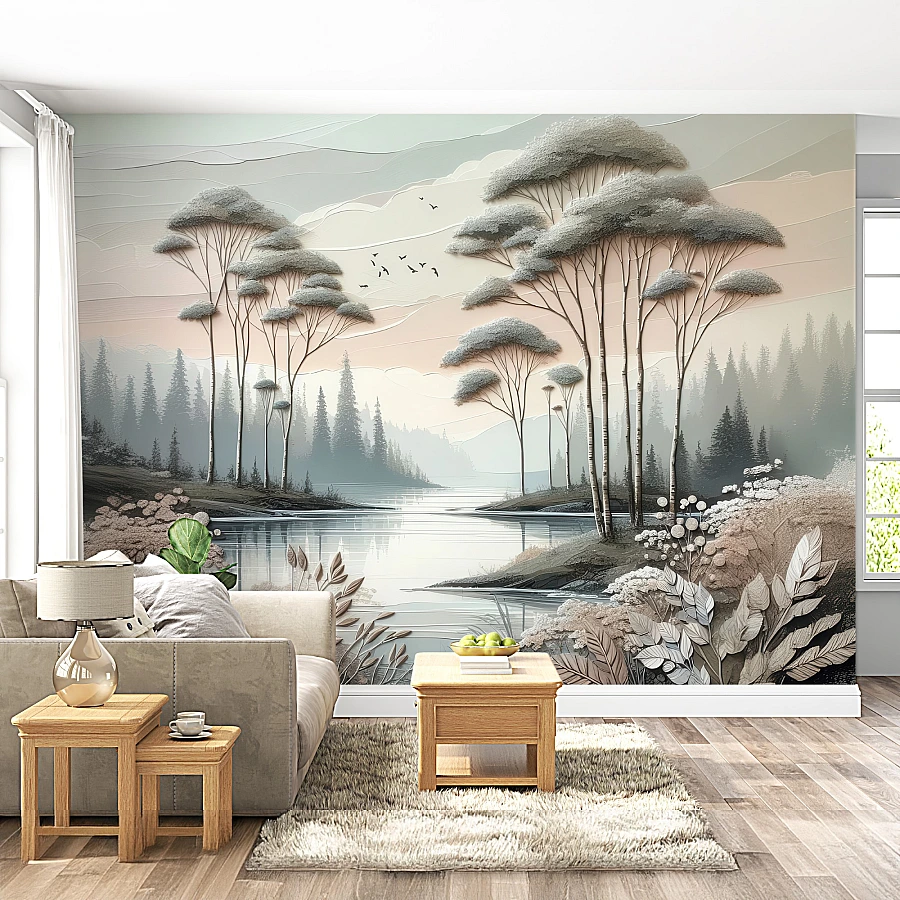 Artistic Lake Forest Wall Mural – Soft Neutral Nature Illustration Design