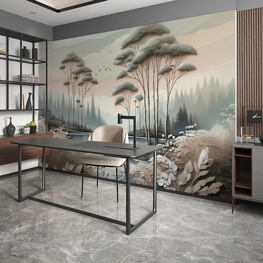 Perfect for sophisticated interiors, this mural transforms the wall into a calm and decorative landscape. It brings artistic character, softness, and a sense of quiet nature into contemporary living and workspace environments.