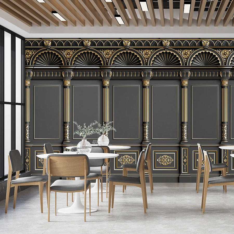 The combination of deep charcoal tones, metallic gold accents, and refined classical motifs gives this luxury panel wall mural a strong sense of depth and prestige. Its structured layout enhances formality while maintaining a sophisticated and polished atmosphere.