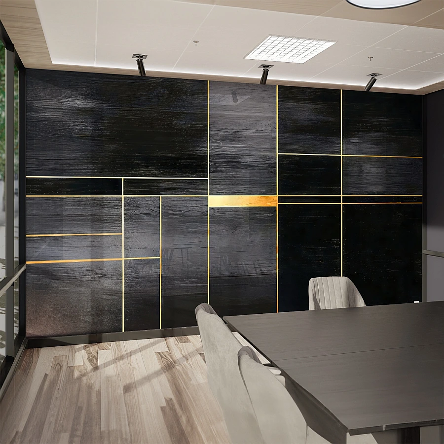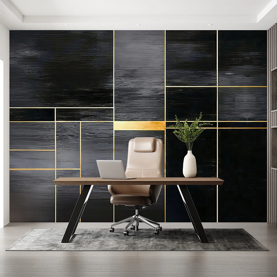 The design features a composition of layered rectangular panels in deep black and charcoal tones, enhanced with sleek gold lines that divide and frame each section. Subtle texture variations across the panels add depth and richness, while the metallic accents introduce a sense of modern sophistication. The clean geometry and contrasting tones create a visually striking yet balanced aesthetic.