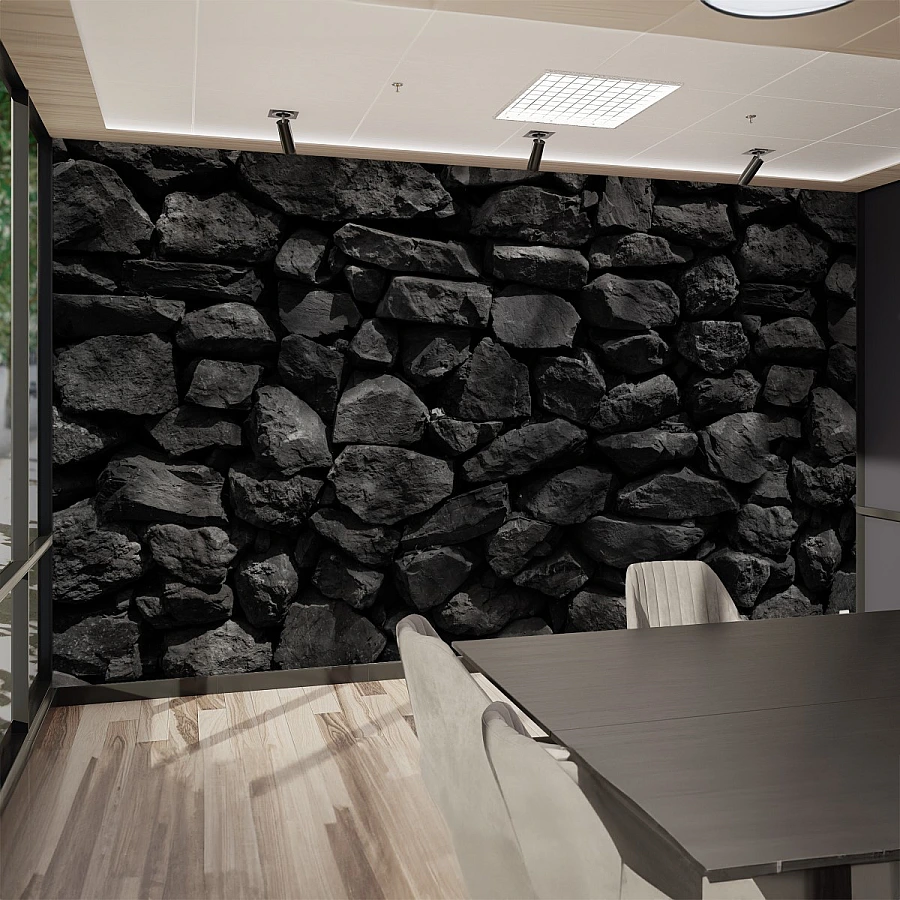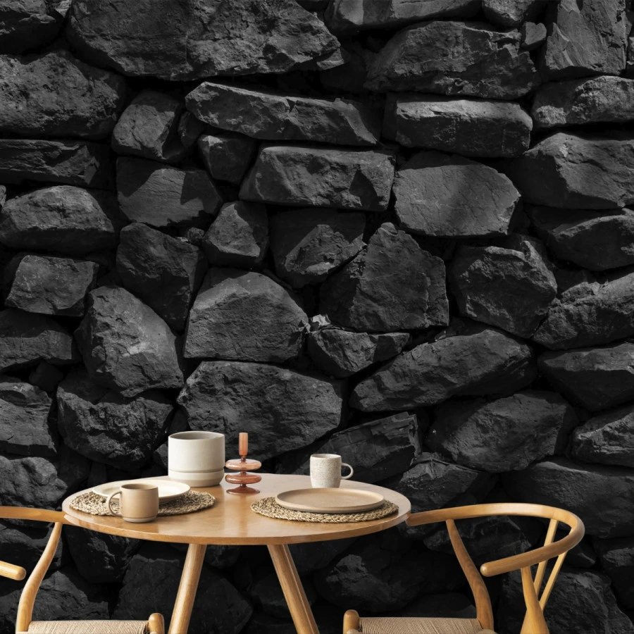 Rough natural stones form a bold and textured surface in this striking stone wall mural. The deep black tones and irregular rock shapes create a powerful visual statement with a raw, architectural feel.