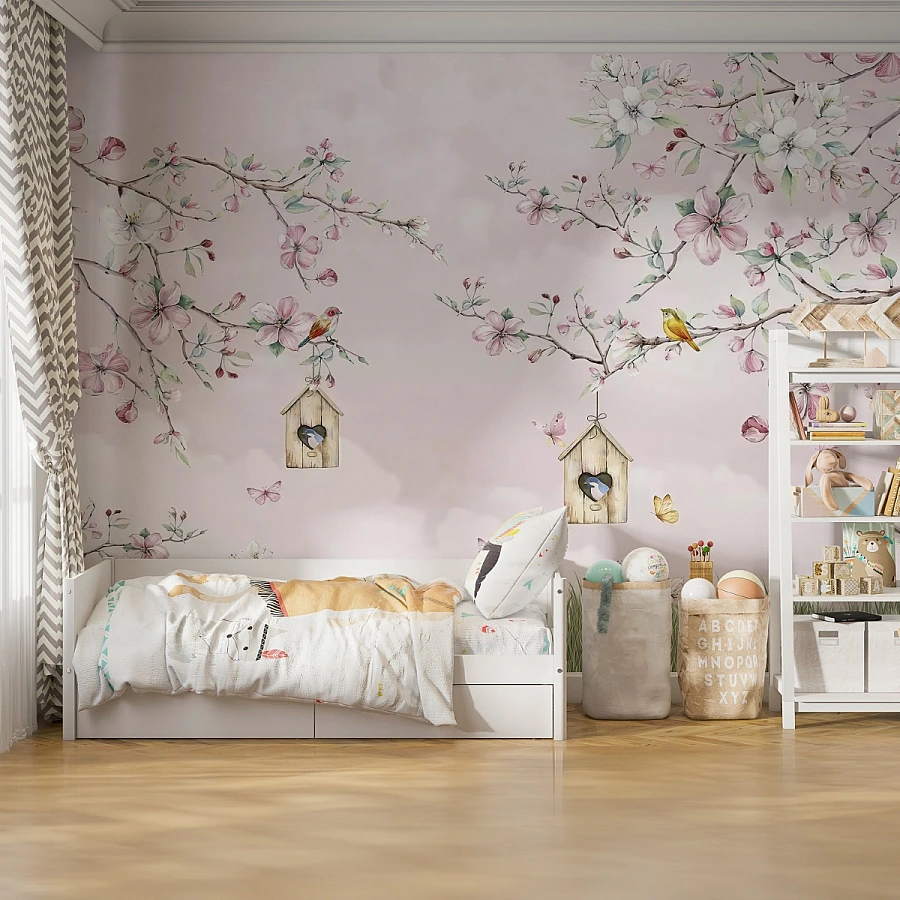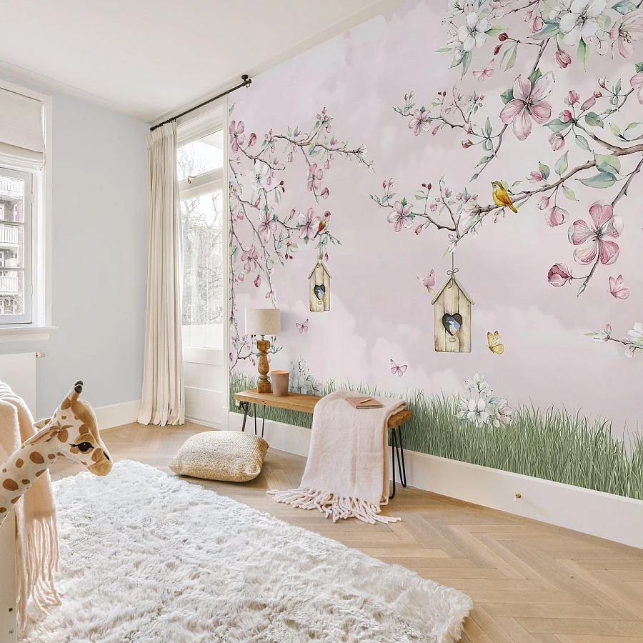 Delicate blossom branches stretch gently across a soft pink sky in this enchanting kids wall mural. Small birds and charming details create a peaceful, storybook-like atmosphere filled with warmth and imagination.