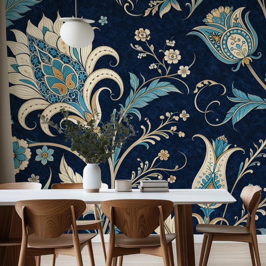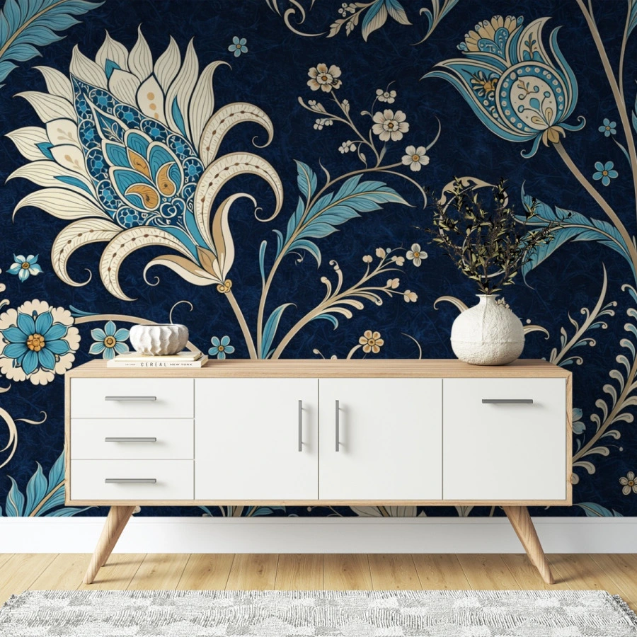 This floral pattern wallpaper features deep navy tones paired with soft beige and shimmering gold accents, offering a timeless and sophisticated aesthetic. The detailed design adds richness while maintaining harmony.