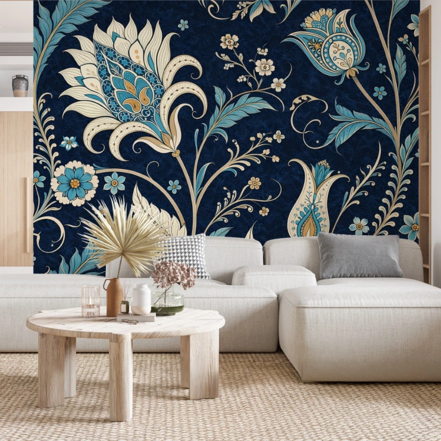 Intricate floral motifs unfold in a luxurious composition of blue and gold in this elegant ornamental wall mural. The flowing patterns create a sense of movement and refined beauty.