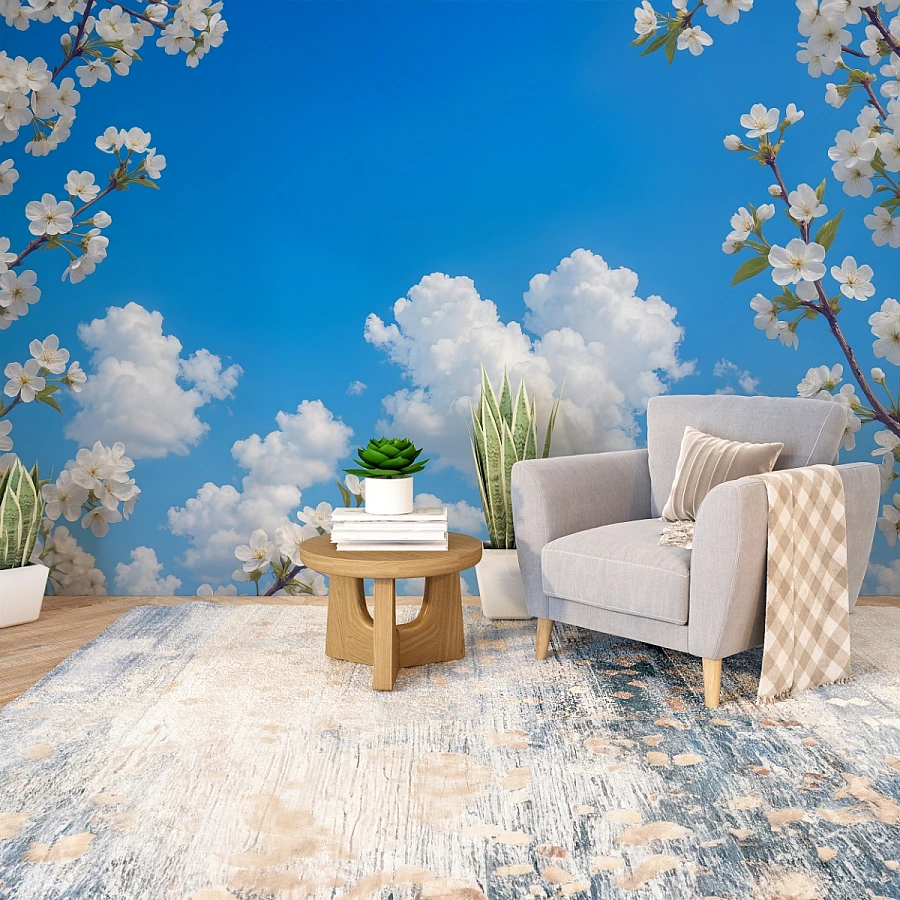 Bring fresh air and elegance into your space with this blue sky floral wall mural, where soft clouds float across a vivid sky framed by delicate white blossoms. The combination of natural elements creates a light, uplifting atmosphere full of serenity and charm.