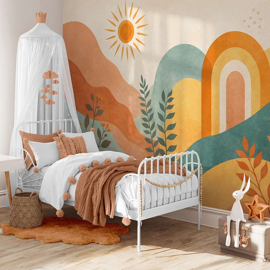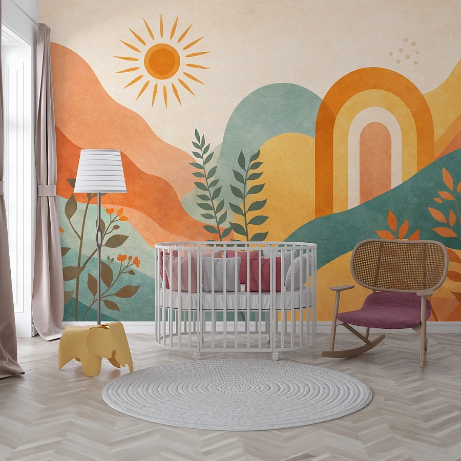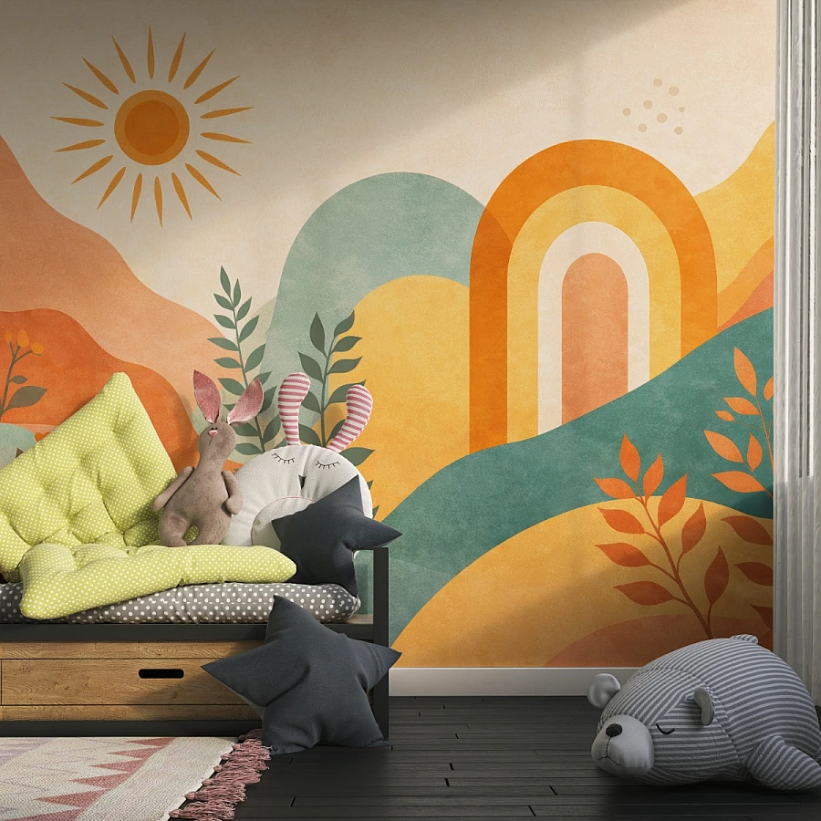 Soft curves, warm colors, and playful shapes come together in this cheerful kids wall mural. The abstract sun, rolling hills, and rainbow arches create a joyful and calming visual perfect for little ones.