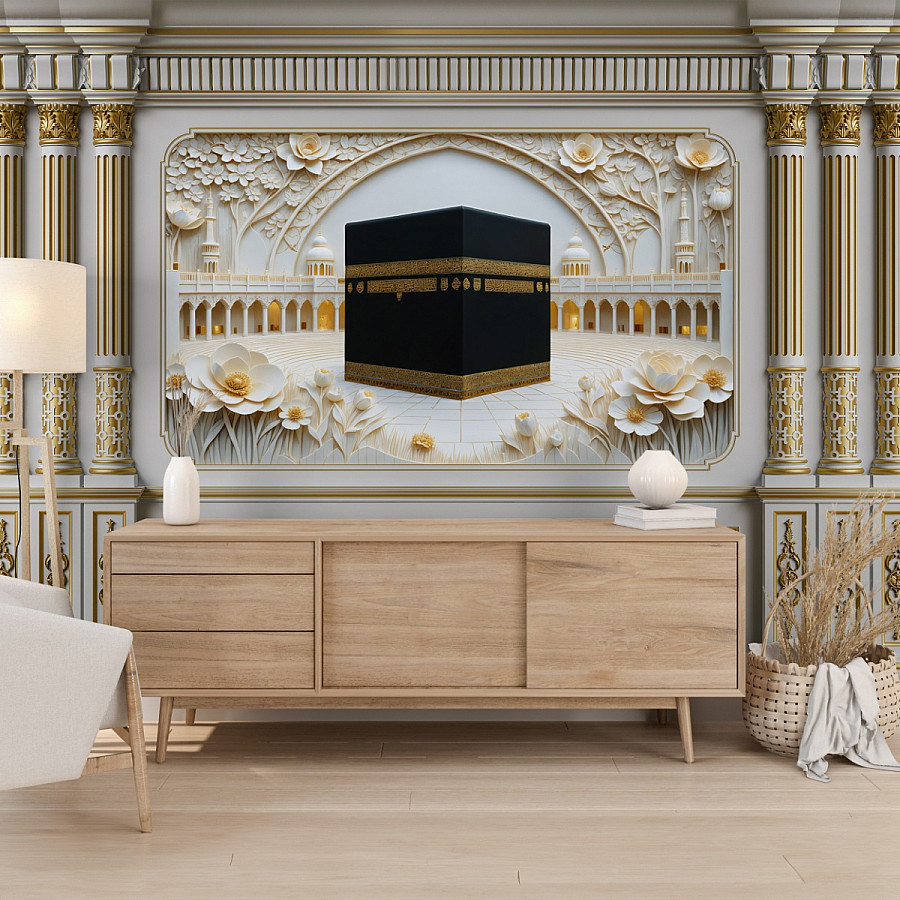 The sacred Kaaba is elegantly framed within a richly detailed classical panel in this stunning Islamic wall mural. Surrounded by ornate columns, floral carvings, and architectural elements, the design evokes timeless grandeur and reverence.