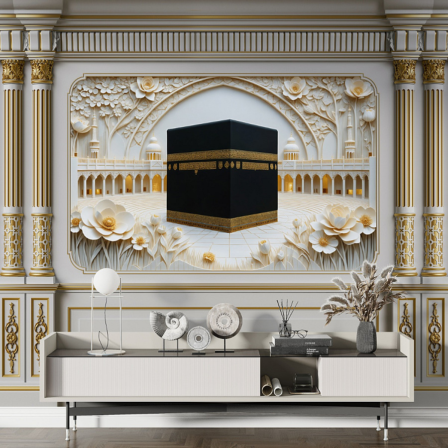 This Kaaba wallpaper features soft ivory tones enhanced with refined gold accents, creating a harmonious and luxurious composition. The intricate 3D-style detailing adds depth, transforming the wall into an architectural masterpiece.