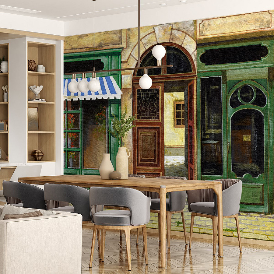 This mural transforms your wall into a picturesque streetscape, perfect for interiors that seek warmth, culture, and visual depth.