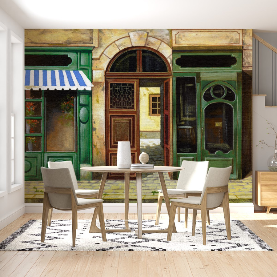 Tags: street facade mural, european wallpaper, old town wall art, doorway mural, vintage architecture wallpaper, dining room decor
