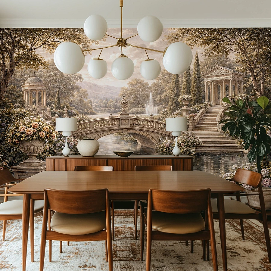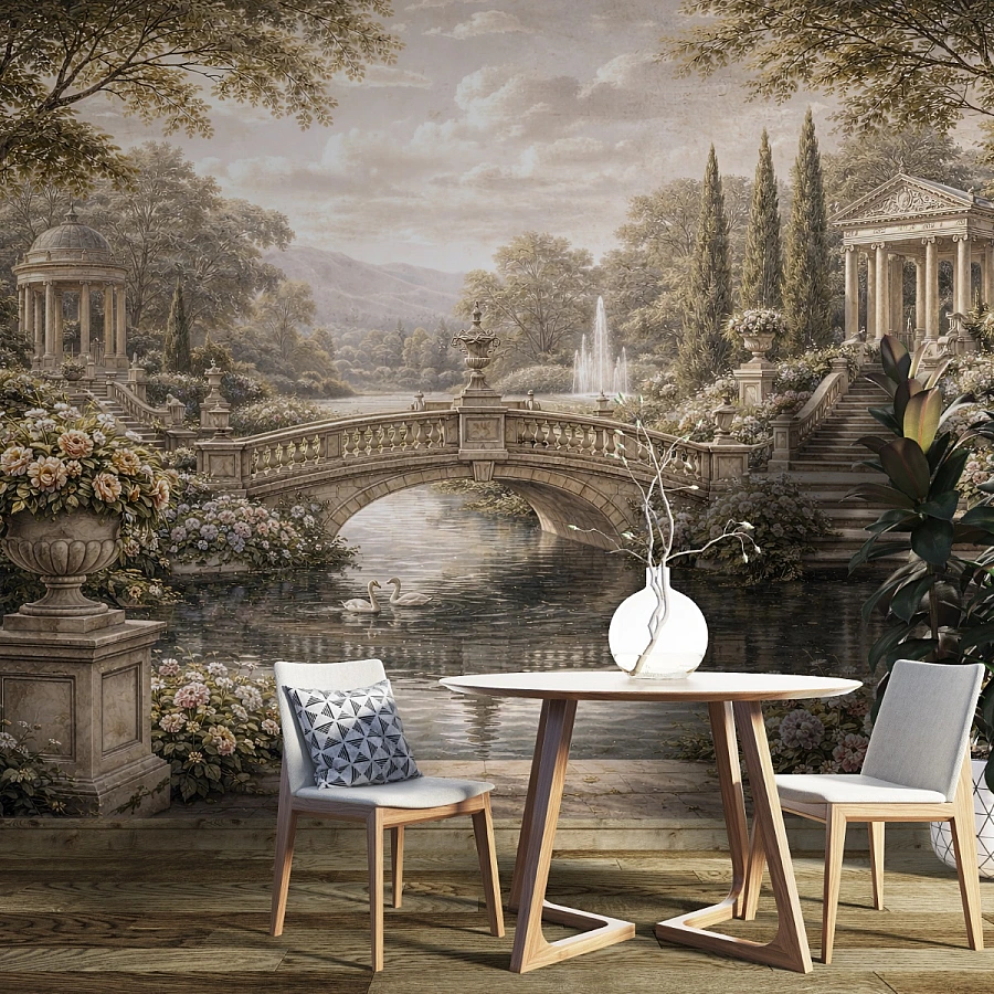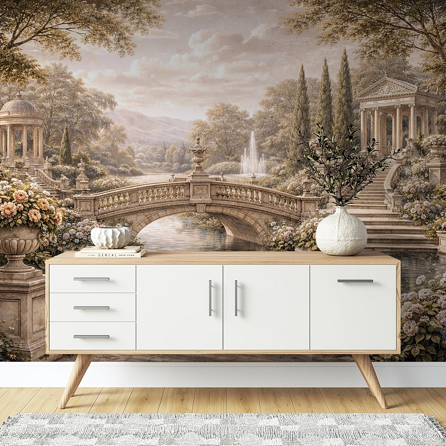 An elegant stone bridge arches gracefully over calm waters in this refined garden landscape wall mural. Surrounded by blooming flowers, classical architecture, and soft greenery, the scene evokes a peaceful European garden filled with timeless beauty.