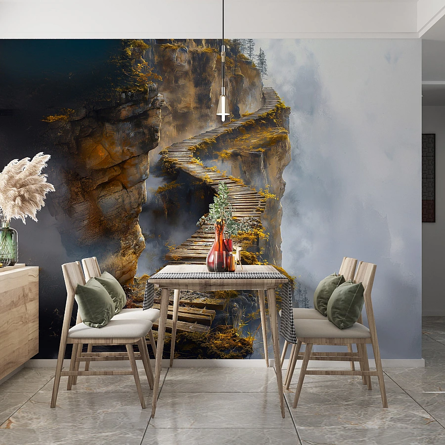 This cliff pathway wallpaper blends rugged rock textures with soft fog and warm autumn tones, producing a powerful contrast between strength and serenity. The perspective enhances spatial depth, making interiors feel more open and immersive.