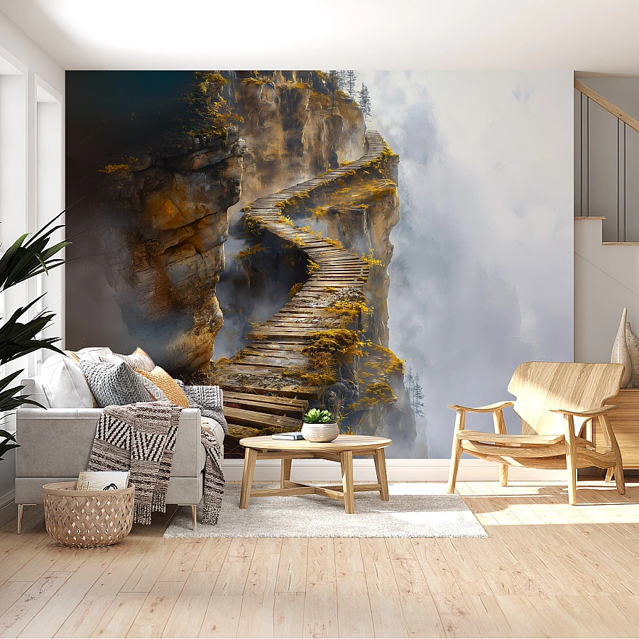 A winding wooden path climbs along dramatic cliffs in this captivating mountain wall mural, creating a sense of adventure and depth. Surrounded by mist and golden foliage, the scene draws the eye upward, adding movement and a dreamlike atmosphere to the space.