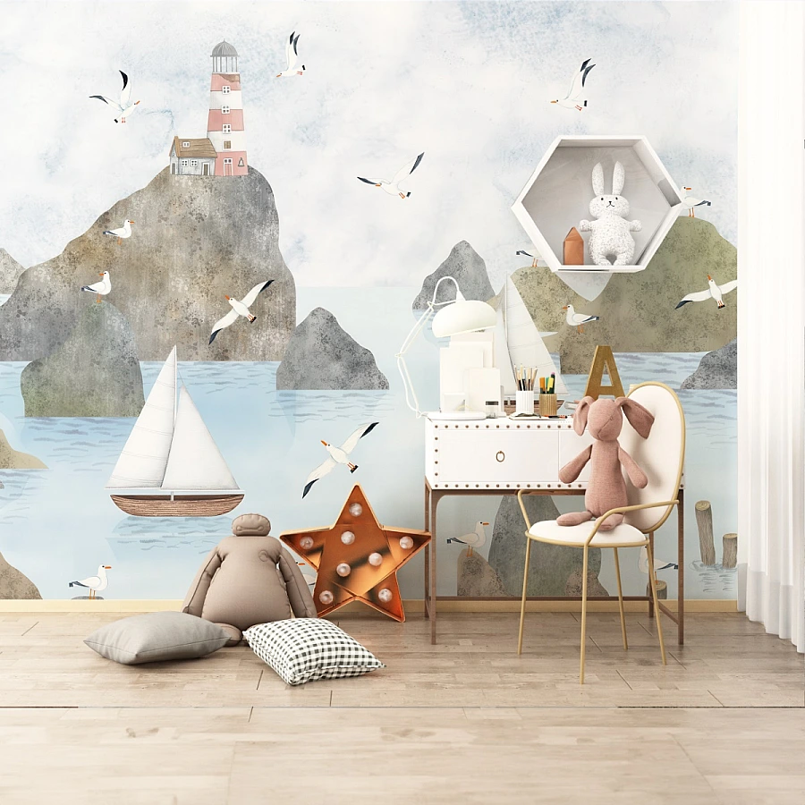 Bring a gentle seaside adventure into your child’s space with this coastal lighthouse kids wall mural, filled with sailboats, seagulls, and peaceful ocean scenery.