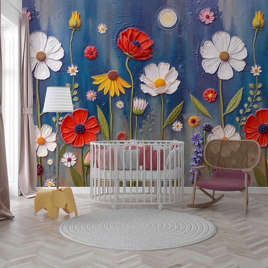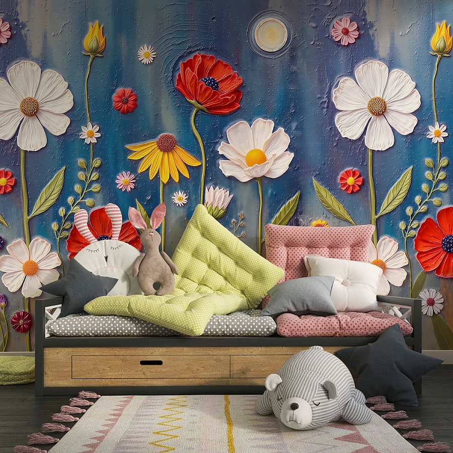 A joyful garden blooms across the wall in this enchanting kids floral wall mural, where vibrant flowers and playful textures create a magical atmosphere. The three-dimensional effect of the blossoms adds depth and charm, turning the space into a cheerful and imaginative retreat.
