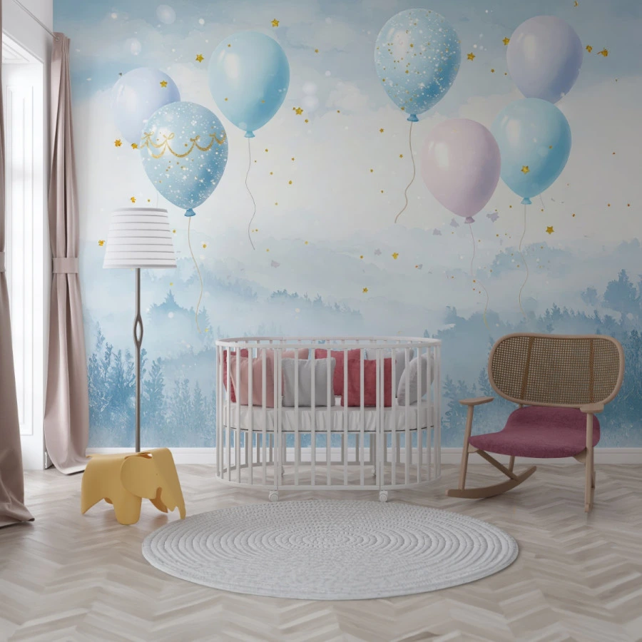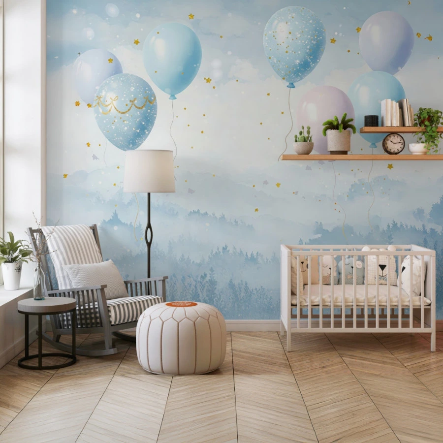 Floating pastel balloons drift gently across a dreamy sky in this enchanting kids wall mural. Soft clouds, tiny stars, and a misty forest background create a magical and calming scene.