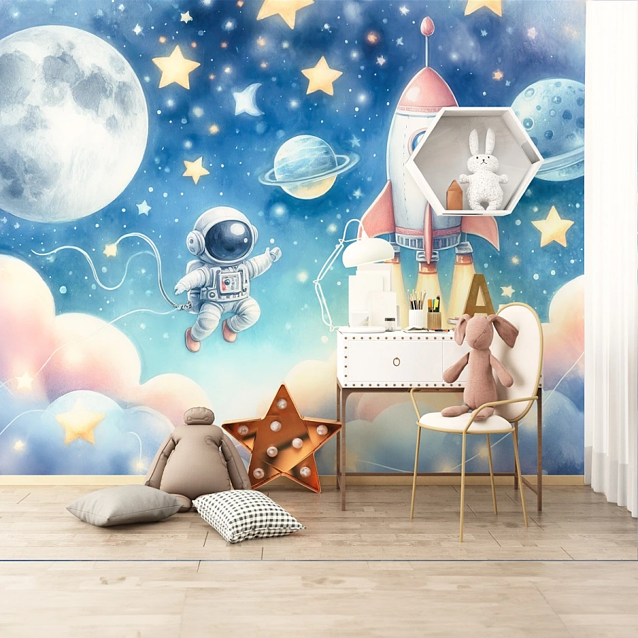 Tags: space mural, astronaut wallpaper, kids rocket mural, nursery space decor, stars wallpaper, kids room wall mural