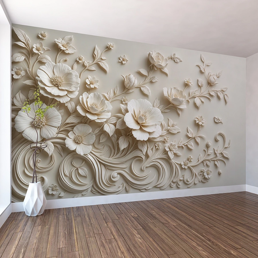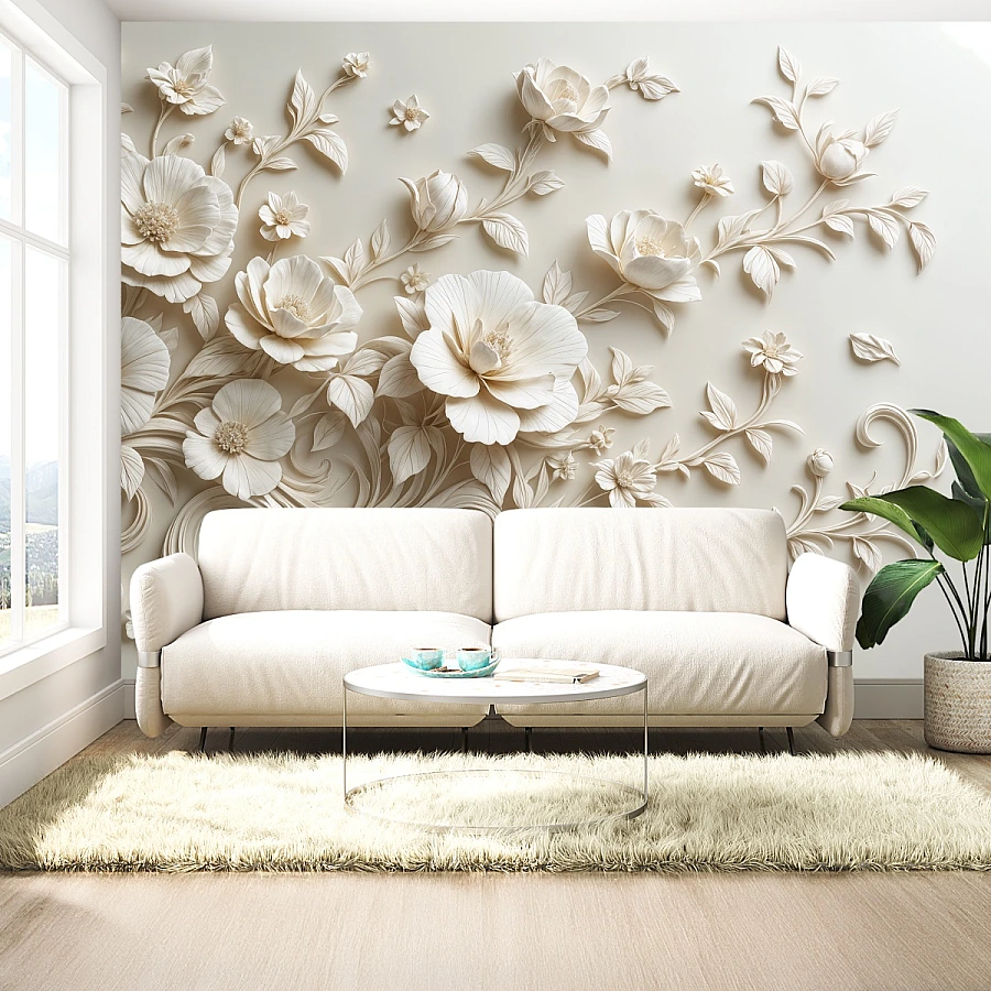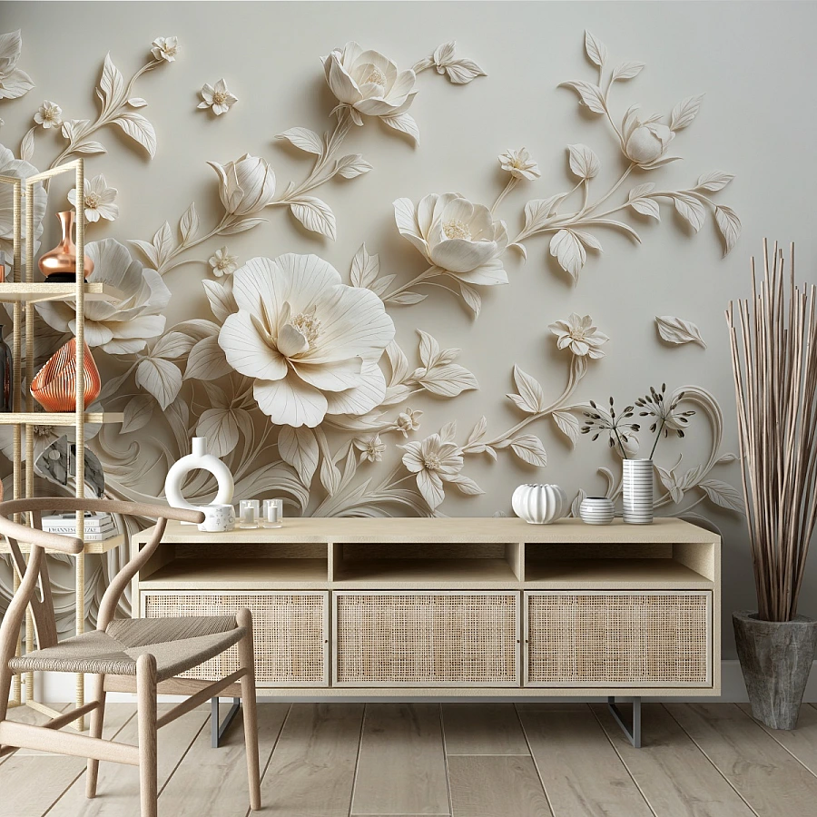 Flowing gracefully across the wall, this 3D floral wall mural brings together delicate blossoms and artistic movement in a refined sculptural composition. Each petal appears gently carved, creating a soft interplay of light and shadow that adds depth and elegance to the space.