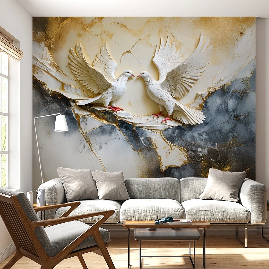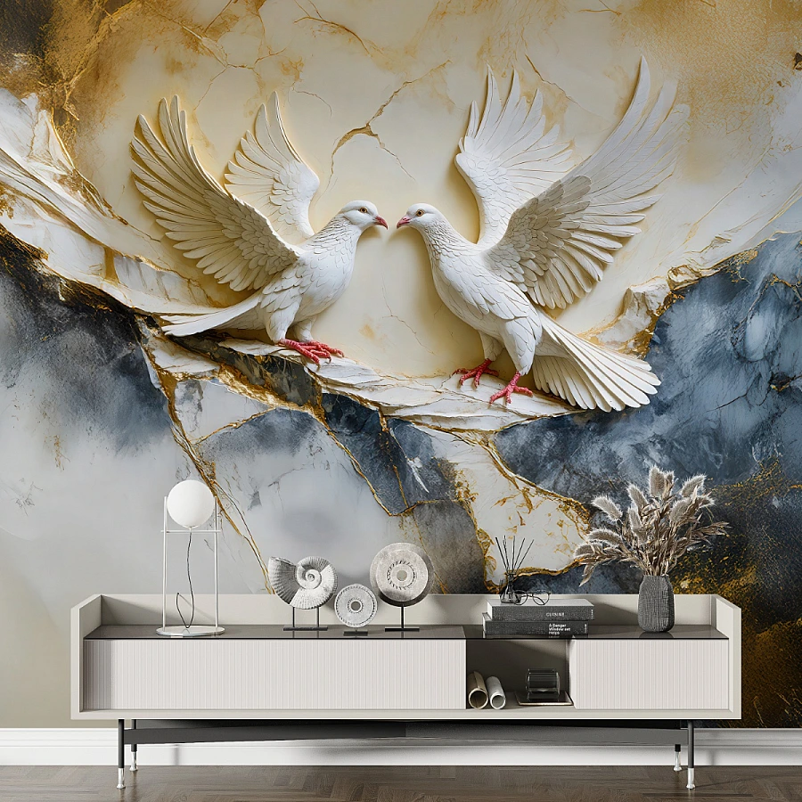 Introduce a sense of peace and refined luxury with this elegant dove marble wall mural, where two graceful white doves meet in a moment of harmony against a richly textured marble backdrop. Accented with flowing gold veins and deep stone contrasts, the design radiates both serenity and sophistication.