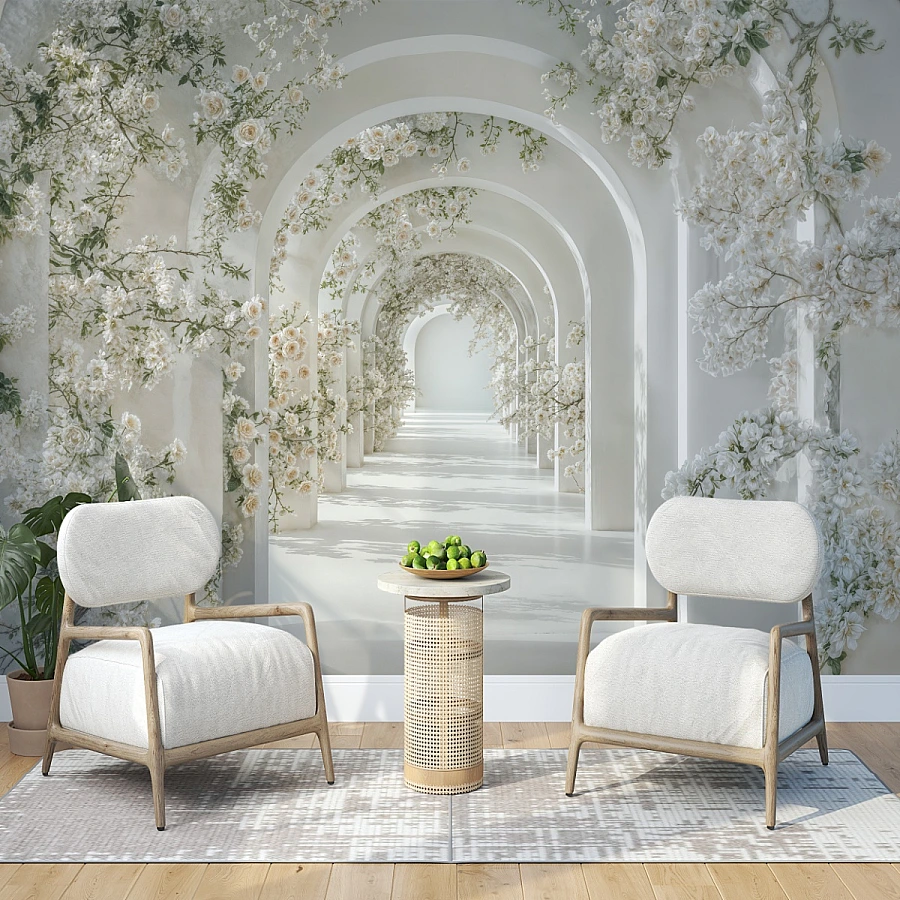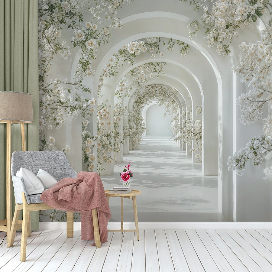 Tags: floral arch wall mural, garden corridor wallpaper, white floral wallpaper, 3d wall mural, elegant wall decor, modern mural design, luxury wallpaper