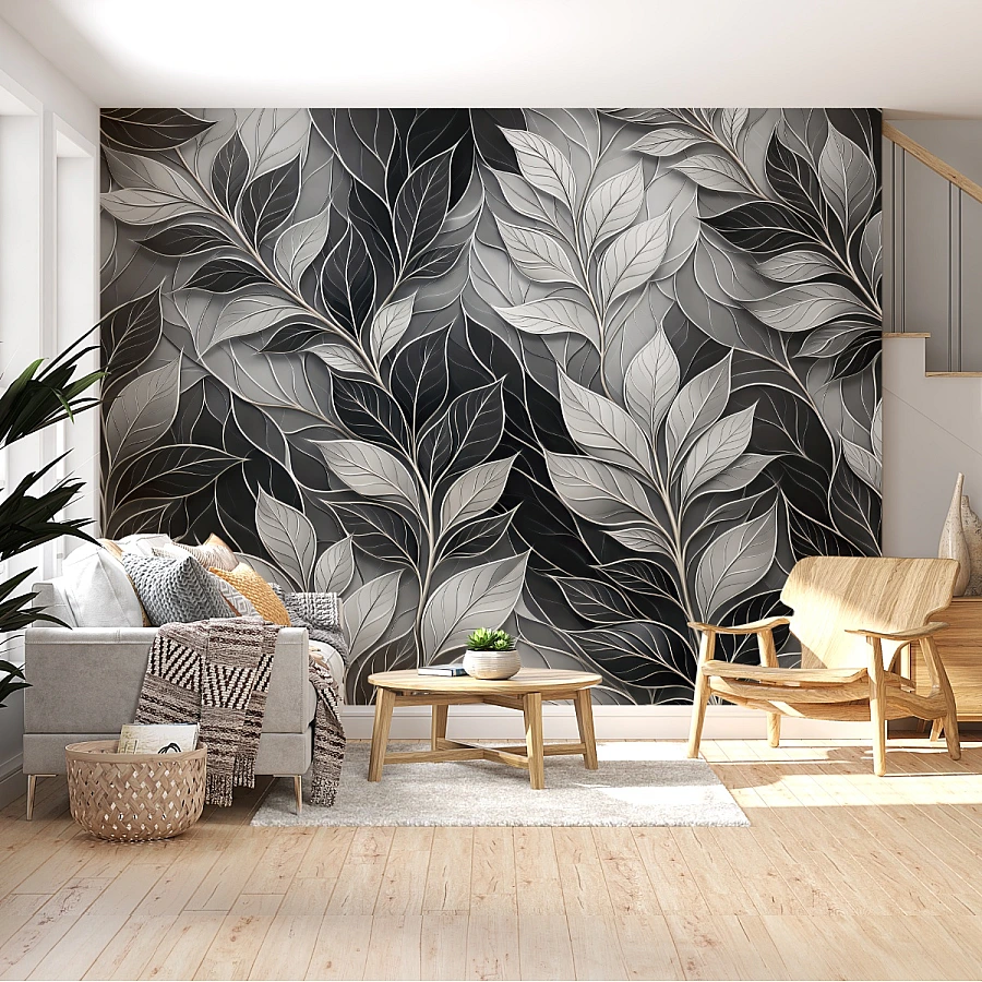 This black and white leaf wallpaper blends soft greys, deep charcoal tones, and light highlights to create a balanced and elegant visual effect. The subtle 3D appearance enhances texture while maintaining a clean and contemporary look.