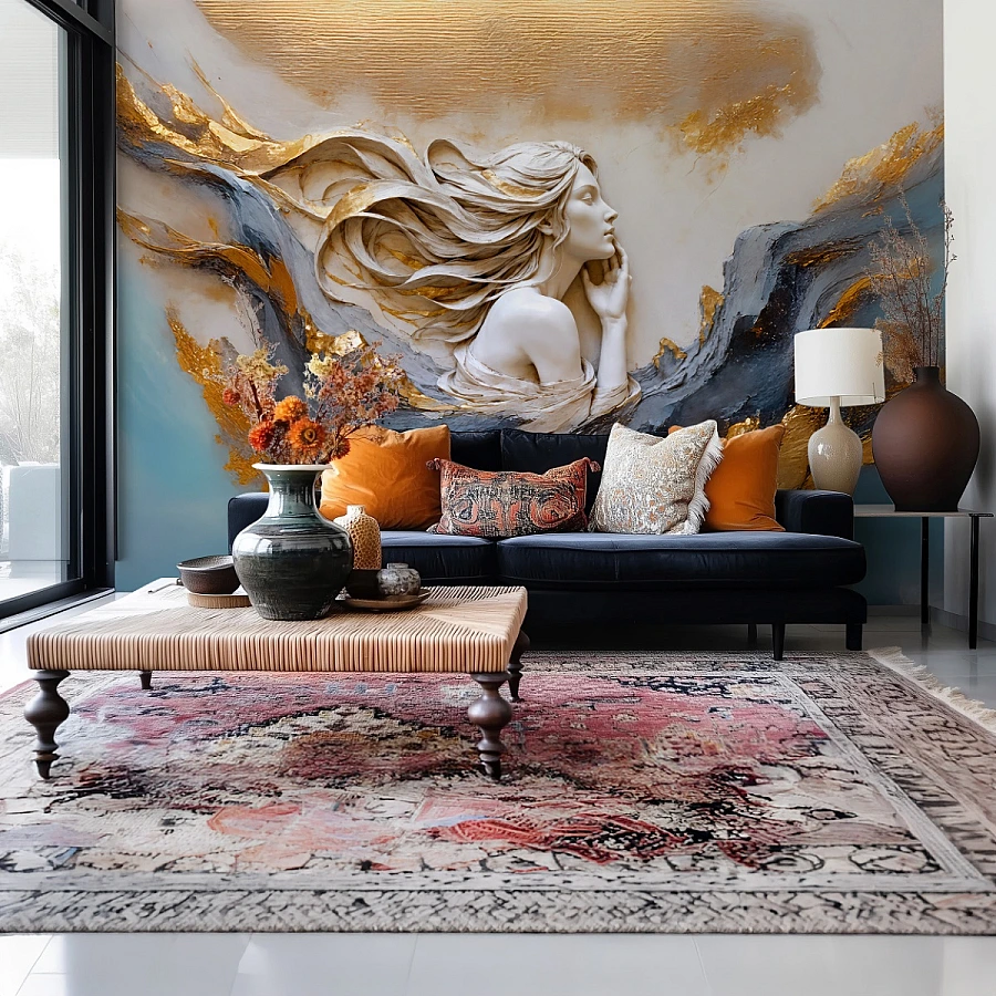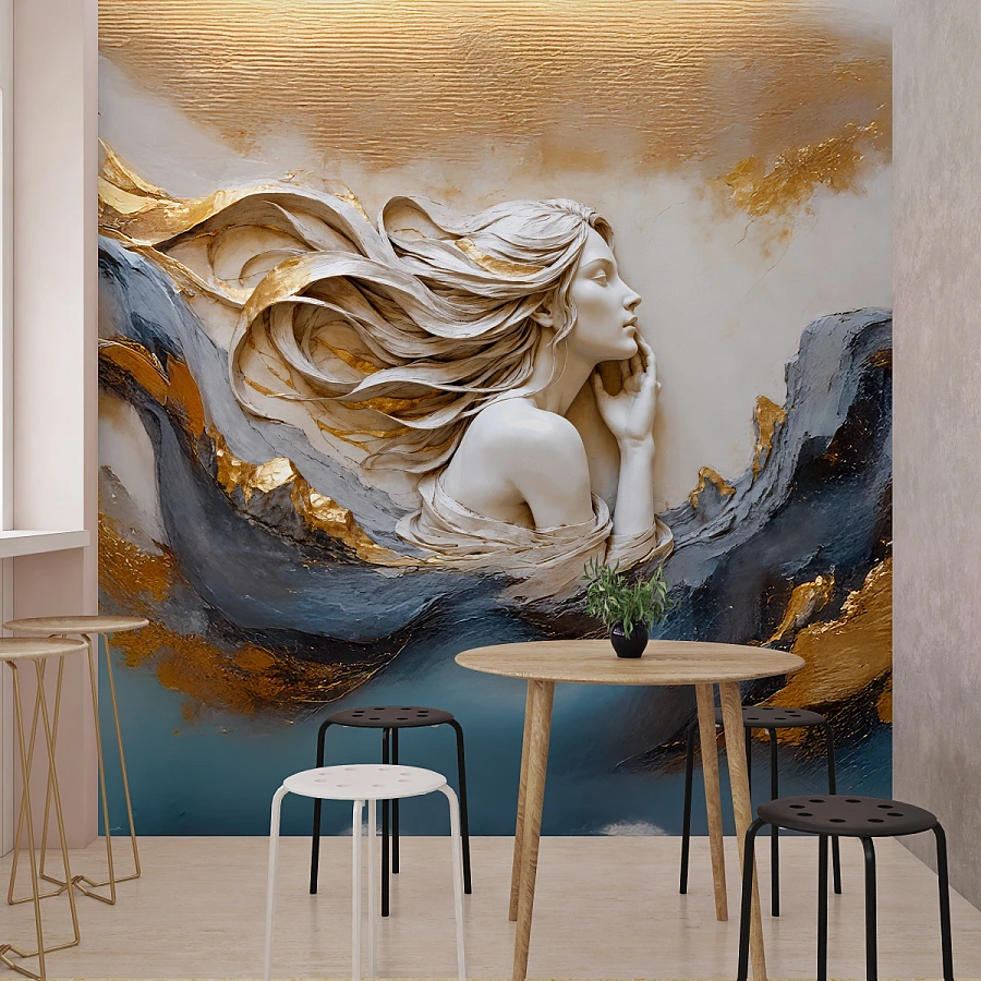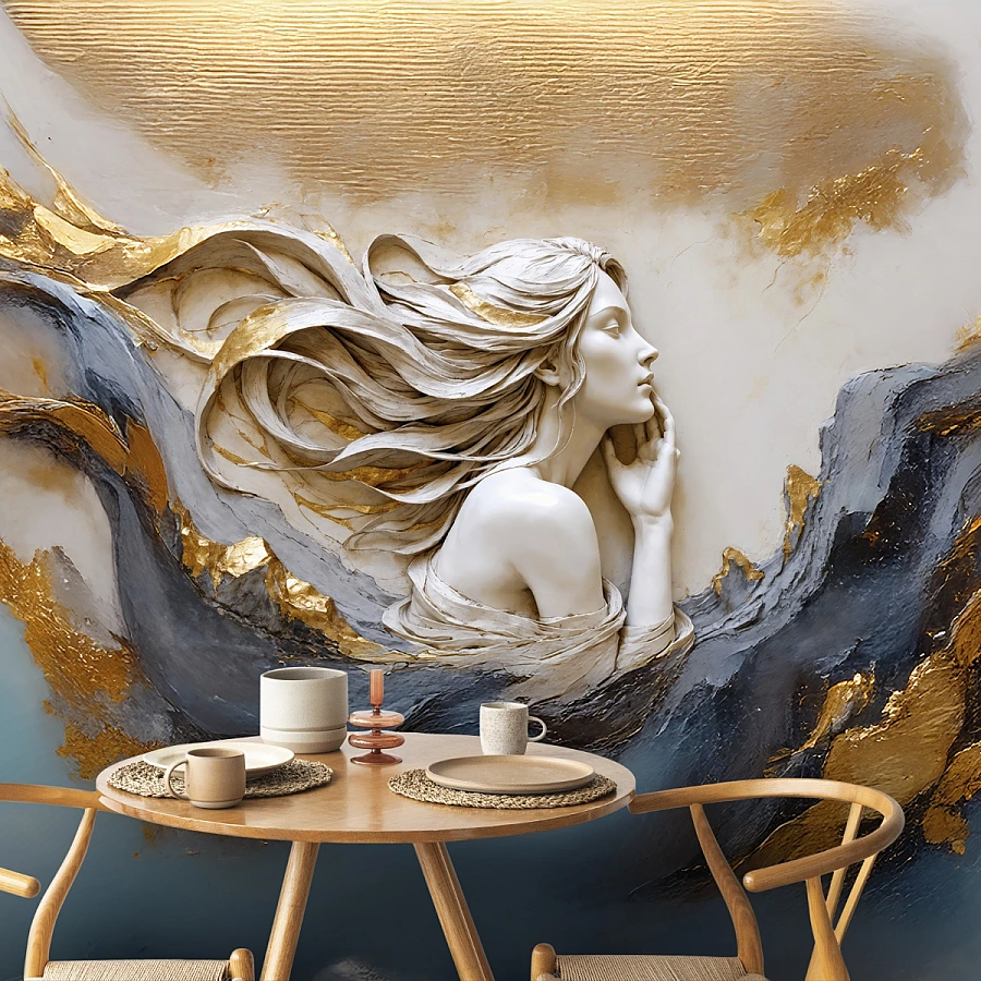 Bring artistic elegance into your space with this abstract woman wall mural, featuring a graceful feminine figure blended with flowing textures and luxurious gold accents. The design creates a soft yet powerful visual statement.