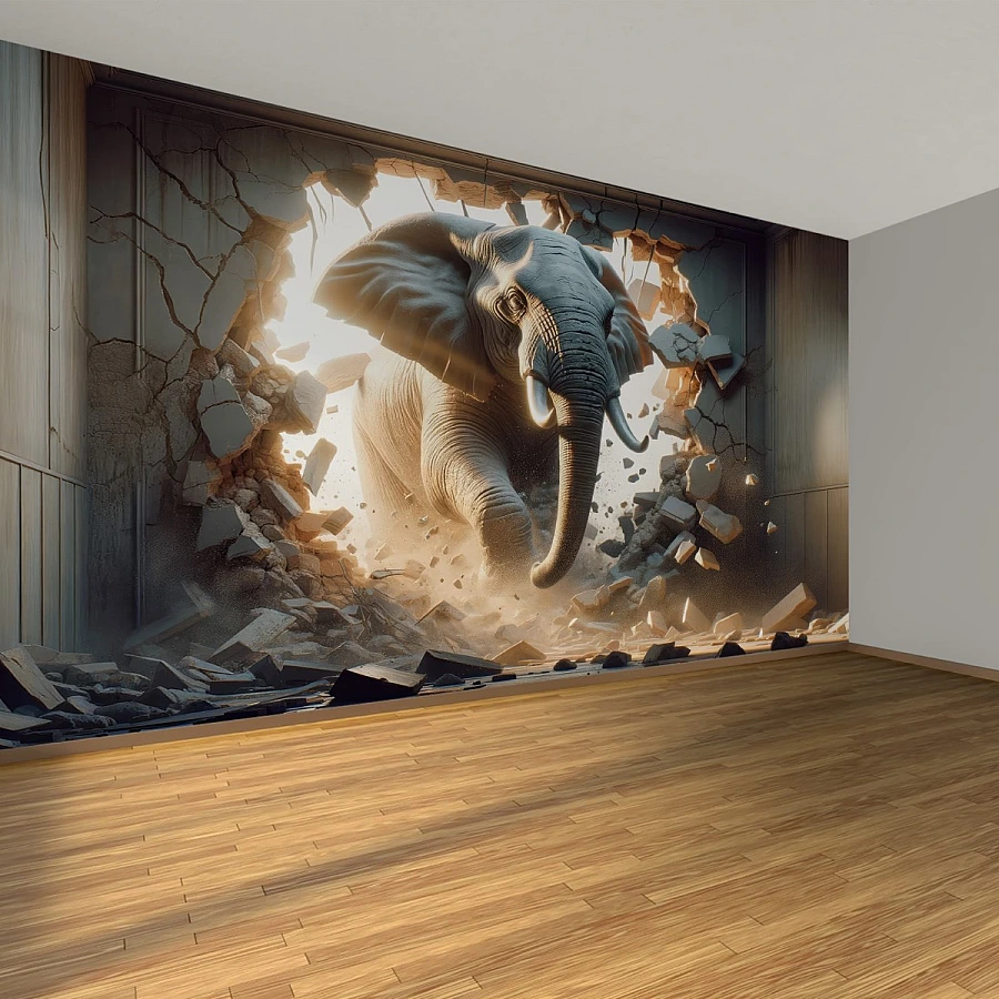 This wildlife illusion wallpaper combines strength and artistry with its detailed textures and dynamic composition. The three-dimensional perspective makes the elephant appear as if it is stepping into the room, adding a striking focal point that instantly captures attention.