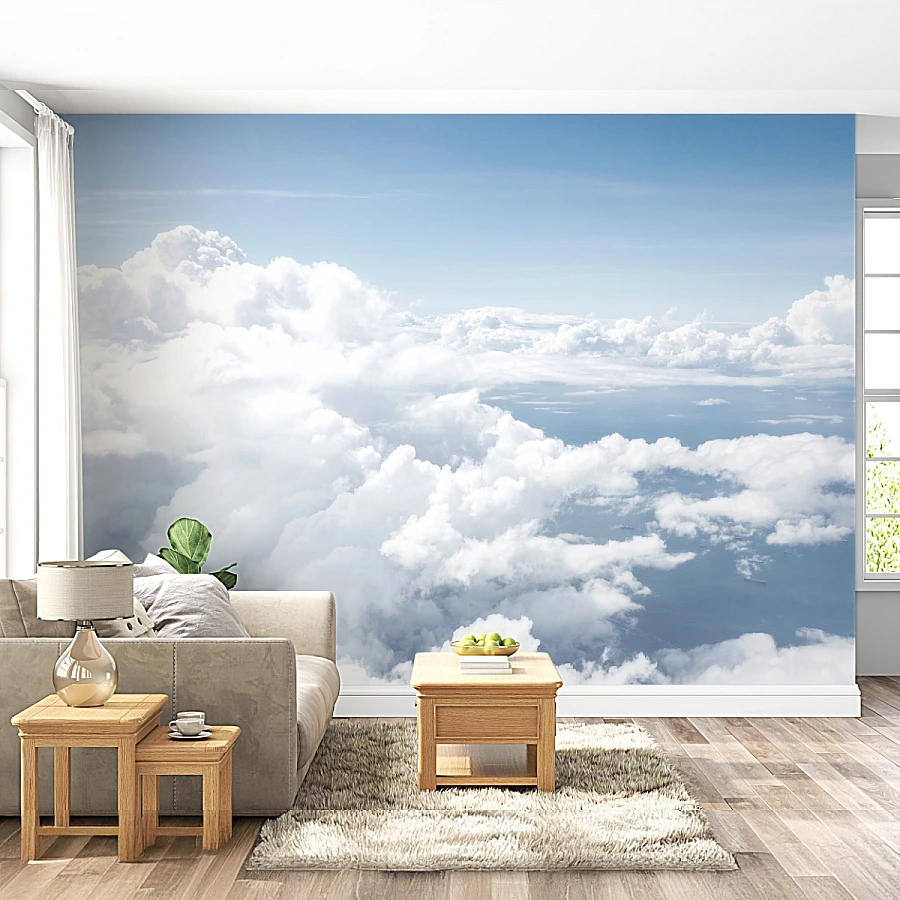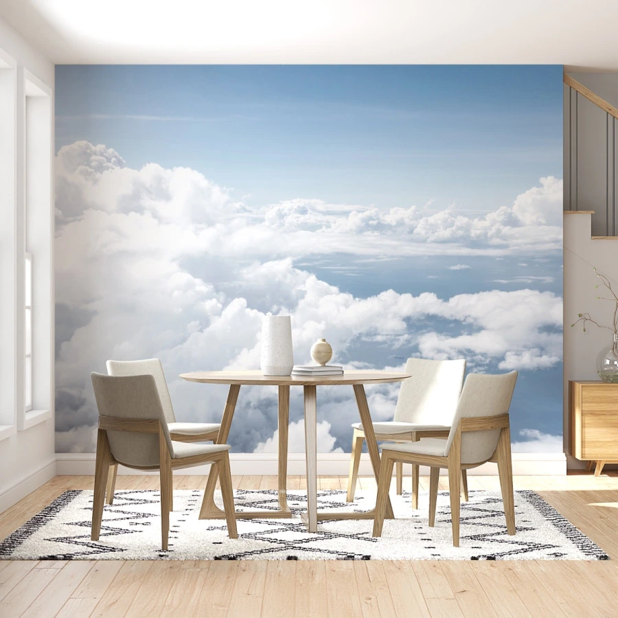 Open your space to infinity with this cloud sky wall mural, where soft white clouds drift across a serene blue horizon. The gentle transitions between sky tones create a calming, airy atmosphere that instantly expands the visual depth of any room.