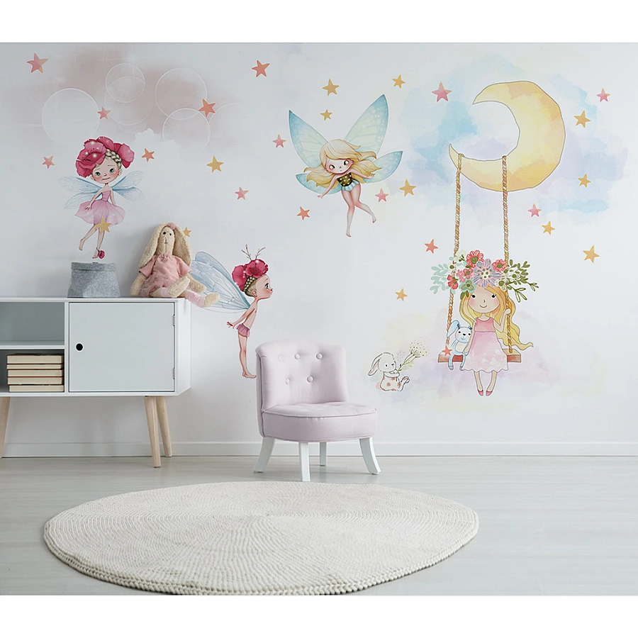 Gentle fairies, glowing stars, and a dreamy crescent moon create a magical scene in this charming fairy wall mural. The soft watercolor details and floating characters bring a light, joyful, and imaginative feeling to the room.
