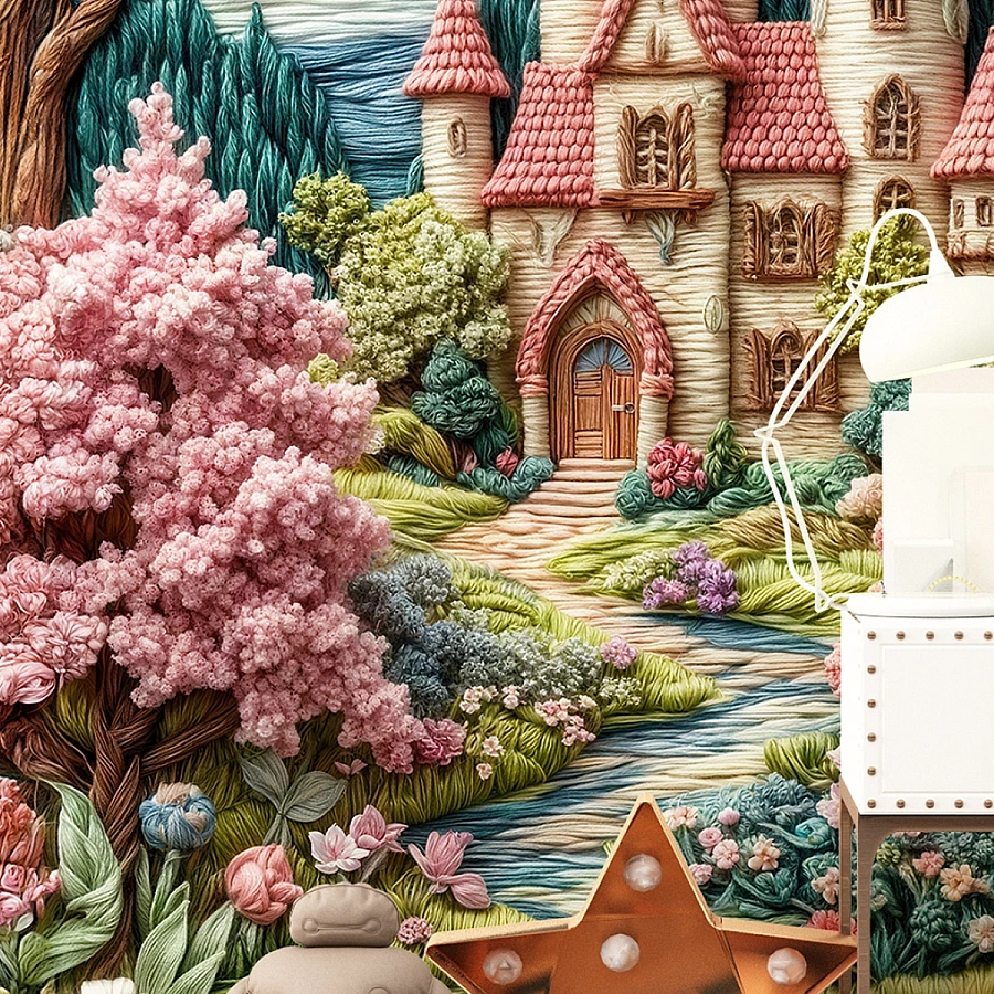 A charming castle rises among blooming trees and soft landscapes in this magical fairytale wall mural. The handcrafted texture and pastel colors create a dreamy storybook scene that feels warm, cozy, and full of imagination.