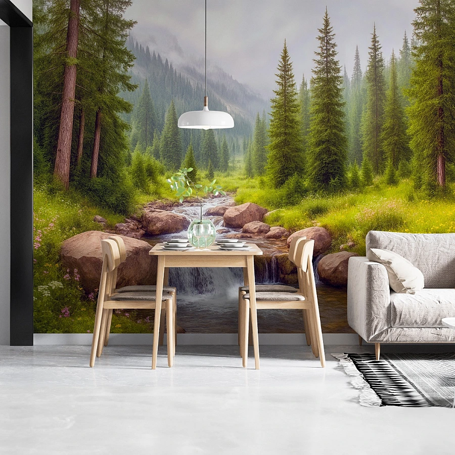 Transform your interior into a peaceful retreat with this forest stream wall mural, where crystal-clear water flows gently through a lush pine valley wrapped in soft morning mist.