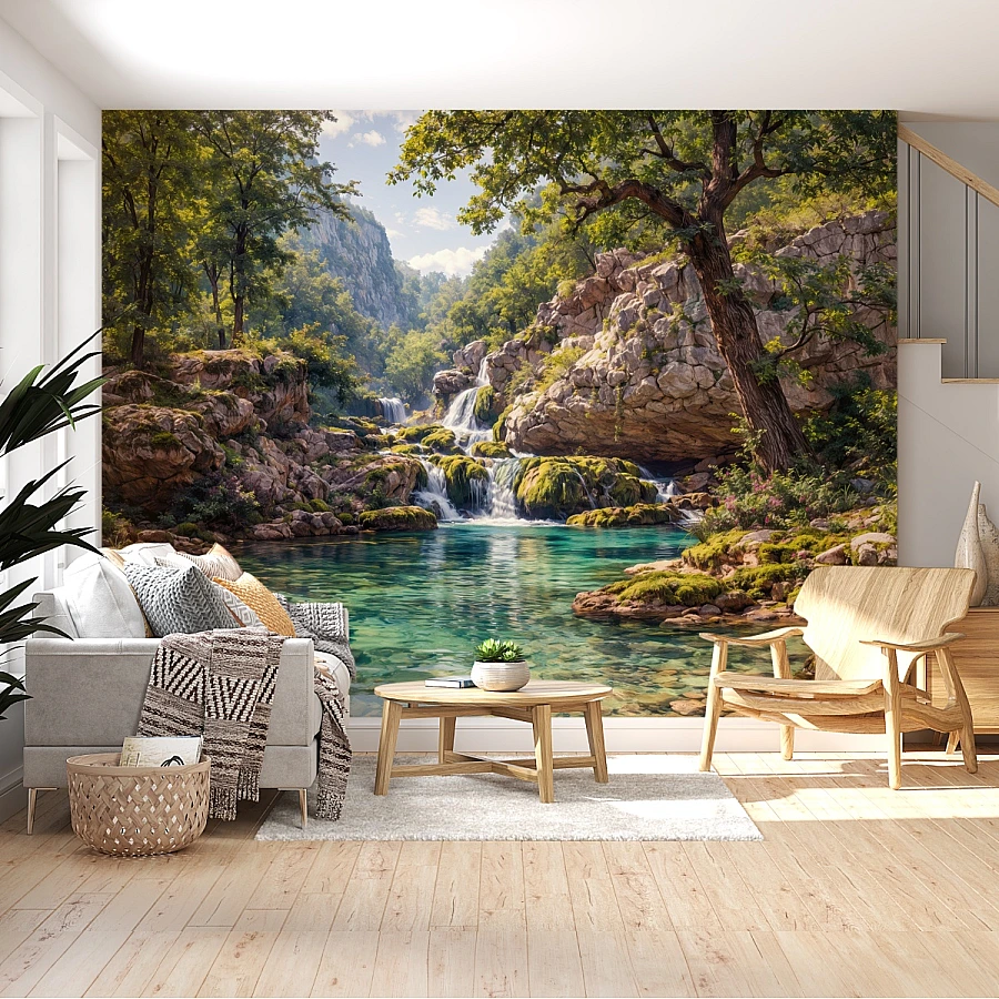 A crystal-clear lagoon flows beneath cascading waterfalls in this breathtaking nature wall mural. Surrounded by rocky cliffs and lush greenery, the scene creates a peaceful oasis full of depth and natural beauty.