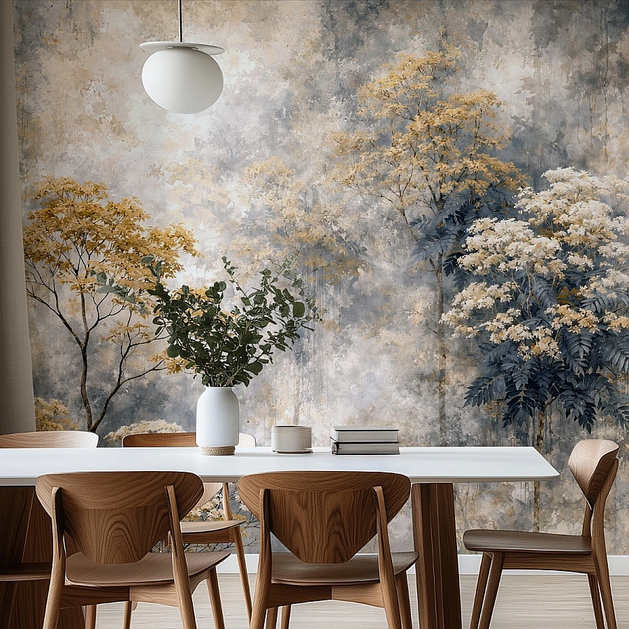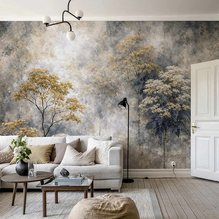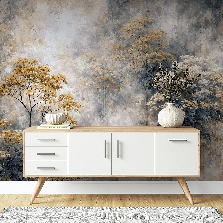 This misty forest wall mural captures the quiet poetry of nature with layered textures, soft transitions, and an atmospheric composition. The fusion of grey, beige, and muted tones creates a refined backdrop, while delicate gold leaf accents bring a subtle glow that elevates the entire wall into an artistic statement.