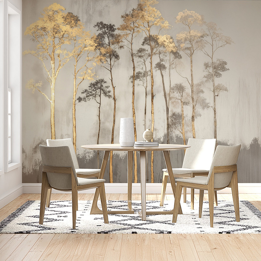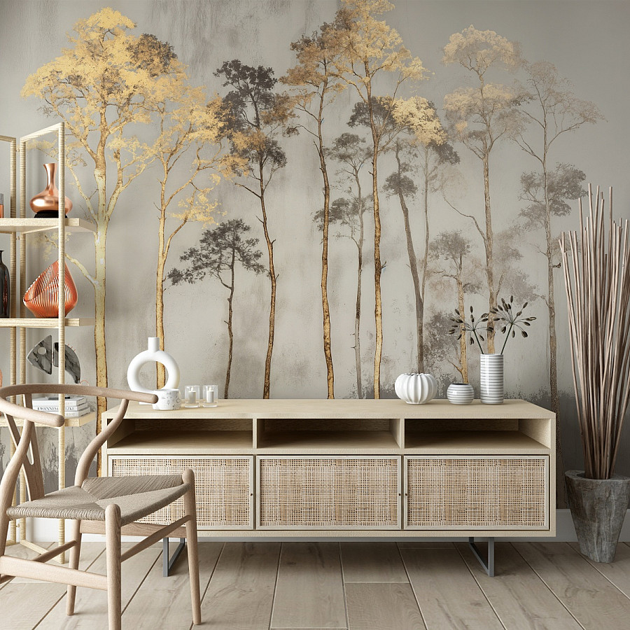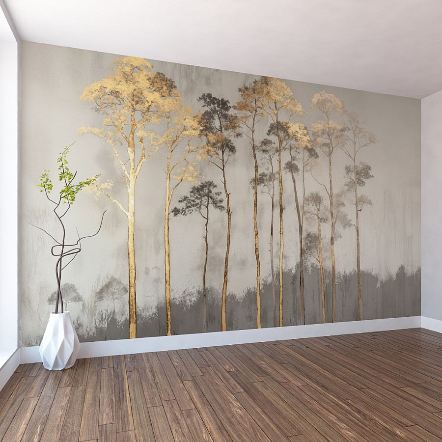 Add a refined artistic touch to your interior with this golden forest silhouette wall mural, where delicate tree forms are highlighted with soft metallic tones.