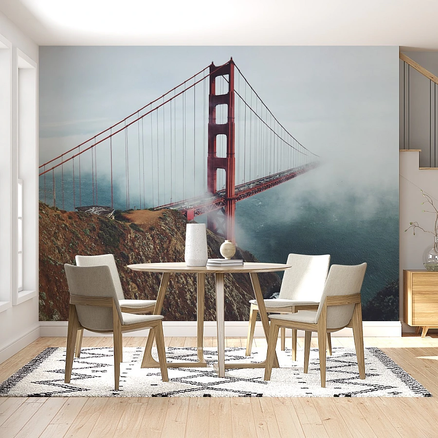 An iconic bridge emerges through soft coastal fog in this stunning cityscape wall mural, capturing the timeless beauty of a world-famous landmark. The sweeping structure and misty atmosphere create a sense of scale, elegance, and quiet drama.
