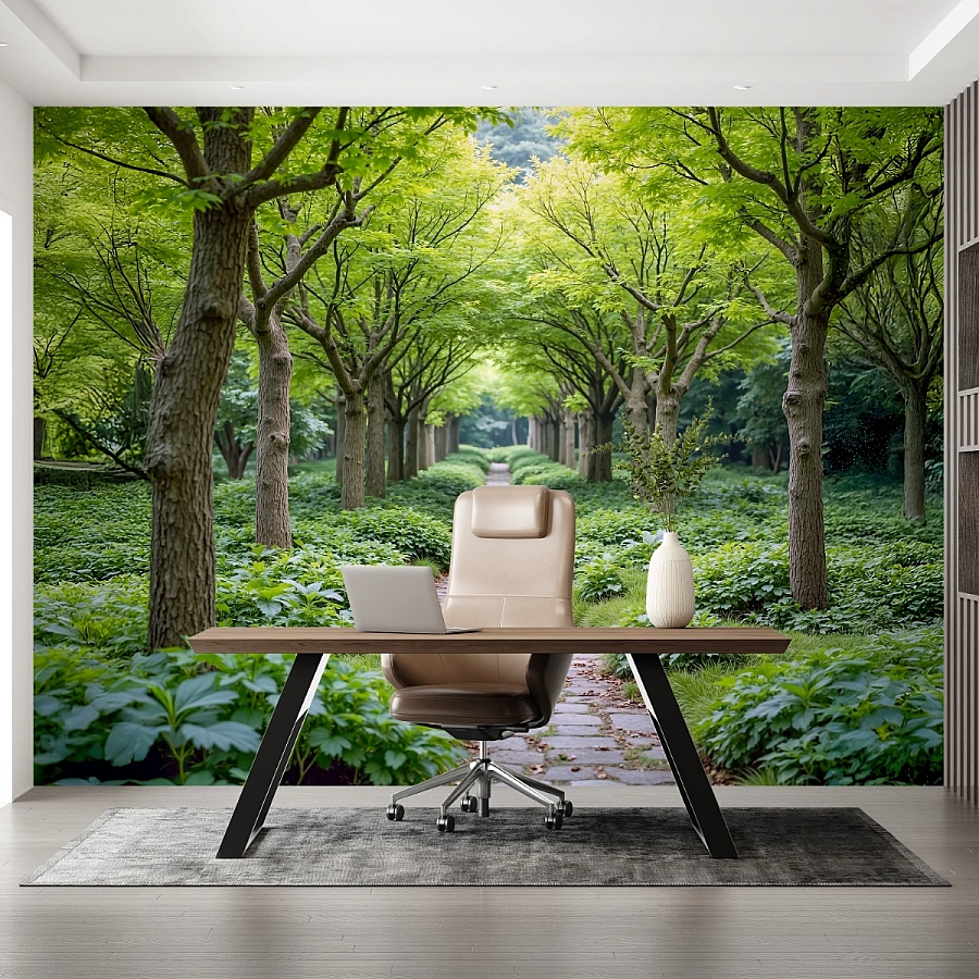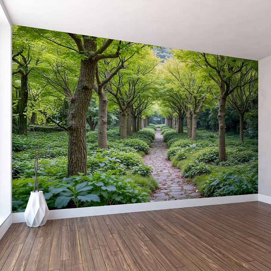 This symmetrical nature wallpaper combines lush green tones with a natural perspective that visually expands the room. The pathway invites a feeling of movement and serenity, making interiors feel more open, organized, and peaceful.